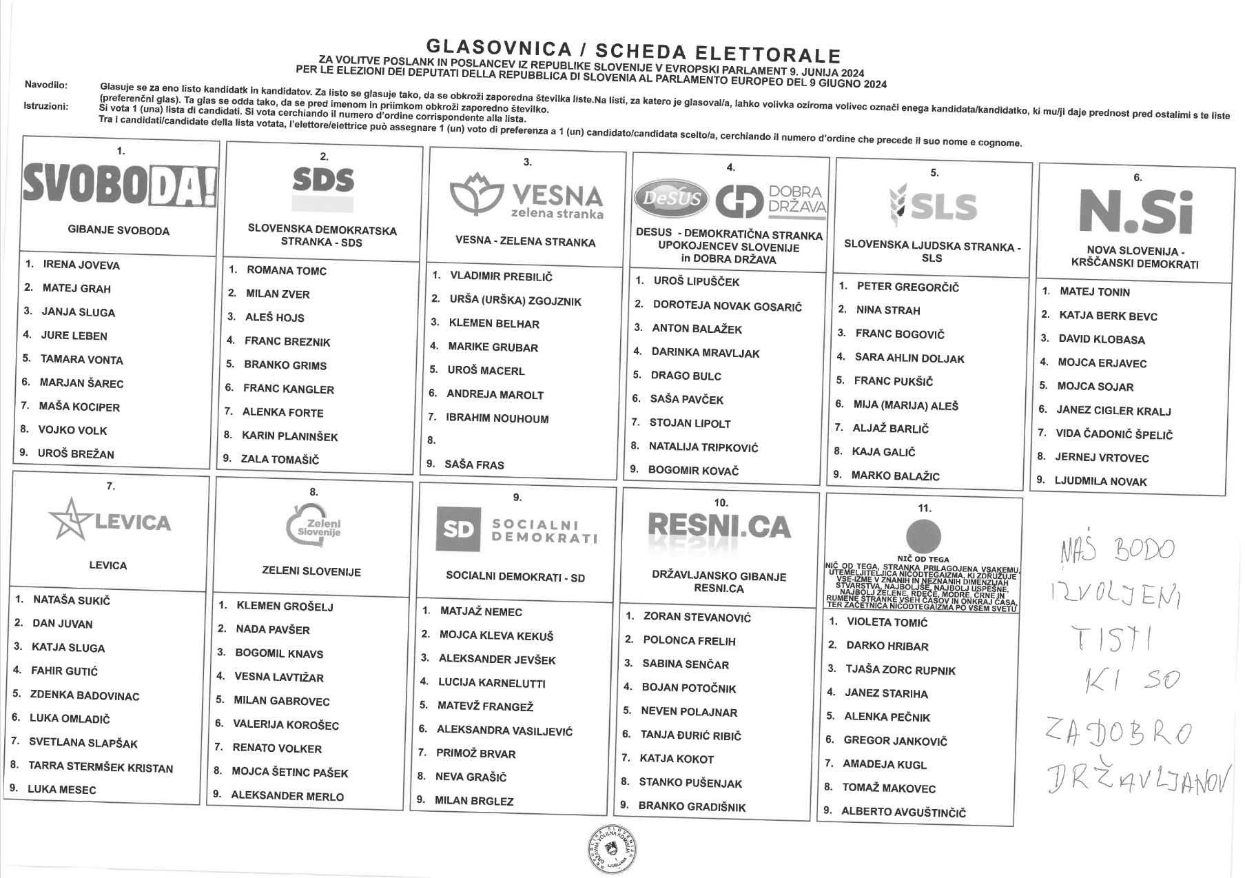 Državna volilna komisija (DVK) je preštela vse glasovnice evropskih volitev in štirih referendumskih vprašanj, ki so potekale 9. junija letos. Ob rekordno visoki volilni udeležbi na volitvah, ki je bila 41,8-odstotna, pa v oči bode veliko število neveljavnih glasovnic. Na DVK sicer pojasnjujejo, da se odstotek neveljavnih glasovnic ne razlikuje bistveno od volitev leta 2004 in 2014, a je ob tem treba poudariti tudi to, da se je takrat volitev udeležilo veliko manj ljudi kot letos. DVK smo zaprosili za vpogled v nekatere od neveljavnih glasovnic. Kaj so volilke in volilci napisali nanje?