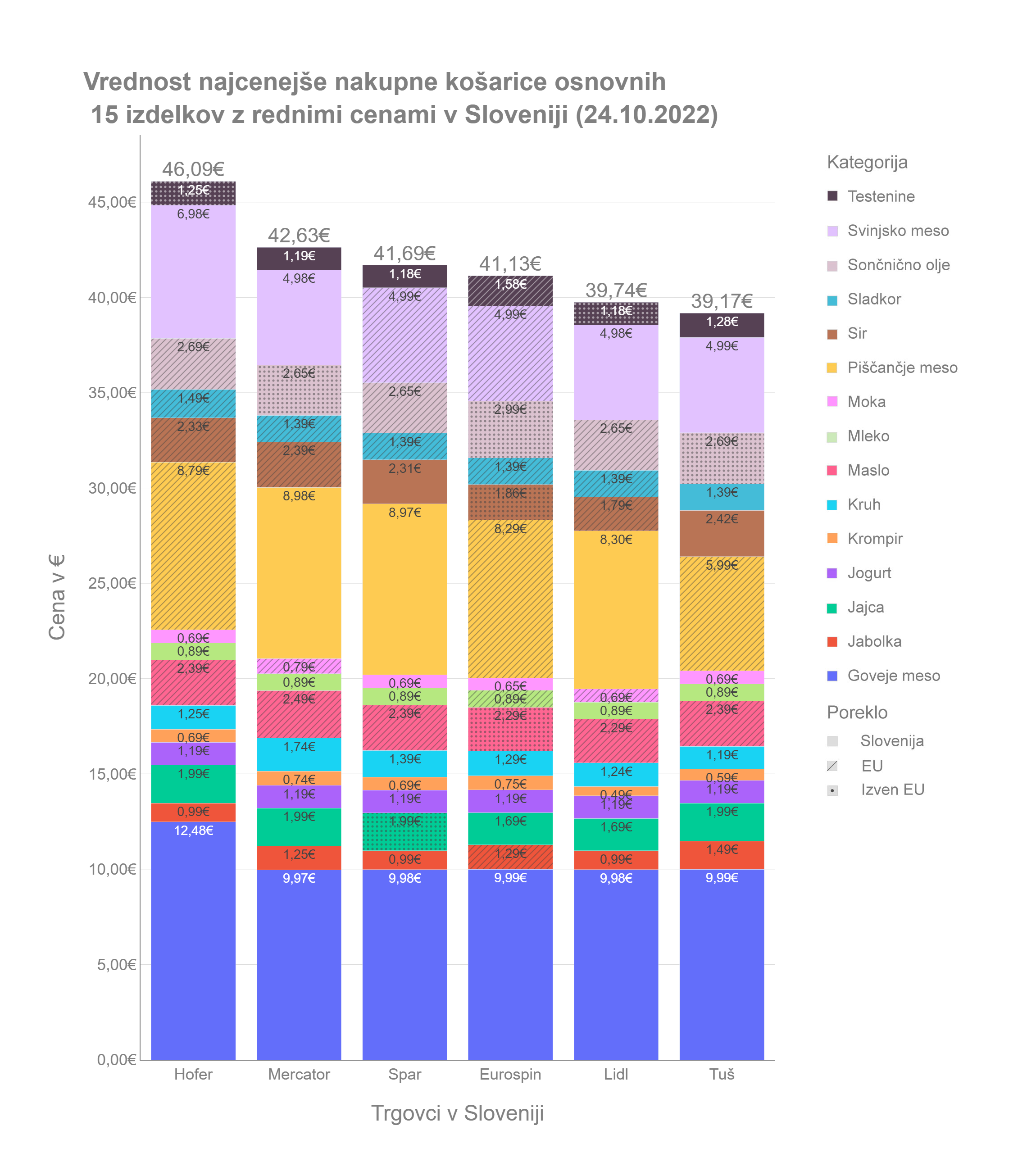 Kot je razvidno iz spletnega primerjalnika cen, ima najdražjo košarico osnovnih živil Hofer, v katerem ta živila skupaj stanejo 46,09 evra. Košarica osnovnih živil je najugodnejša v Tušu, kjer potrošnik za osnovno košarico odšteje 39,17 evra. V grafu so prikazane cene najcenejše košarice po trgovcih.