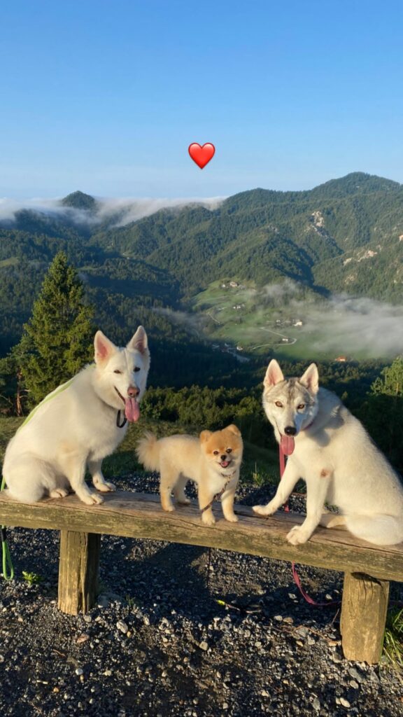 Na družbenem omrežju Instagram je tako objavila novo fotografijo kosmatincev na klopi, medtem ko se za njimi razprostira čudovit razgled na naravo. Zaročenka košarkarskega asa je objavo pospremila z rdečim srčkom.