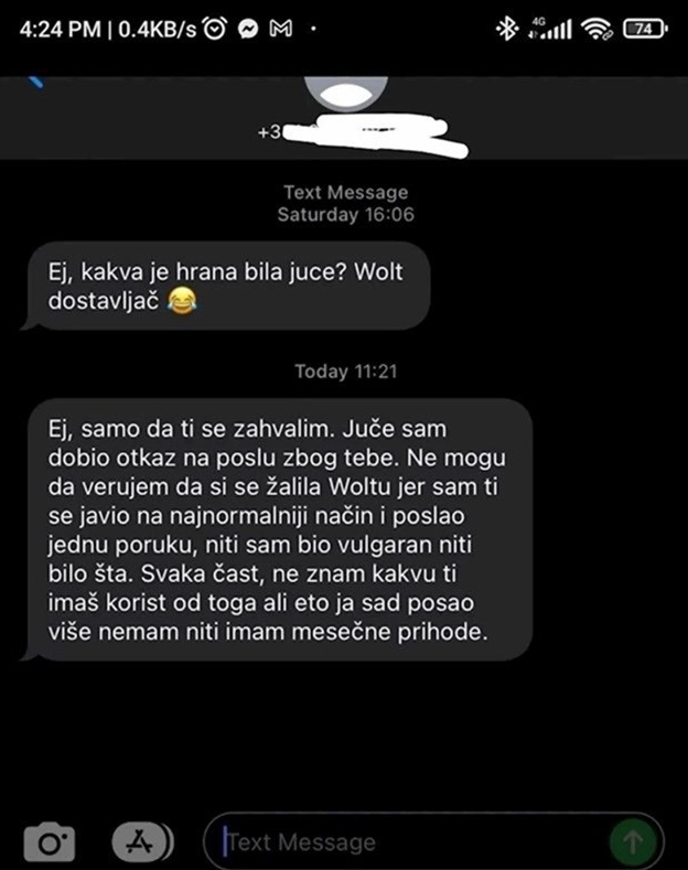 Kot lahko sklepamo iz fotografije, se je stranka zaradi nenavadnega vprašanja pritožila podjetju, dostavljalca pa so odpustili. "Samo, da se ti zahvalim. Zaradi tebe so prekinili sodelovanje. Ne morem verjeti, da si se pritožila Woltu, šlo je za običajno vprašanje in sporočilo, nisem bil vulgaren. 'Vsaka čast', ne vem, kakšno korist imaš od tega, ampak nimam več službe niti mesečnega prihodka," je še zapisal.
