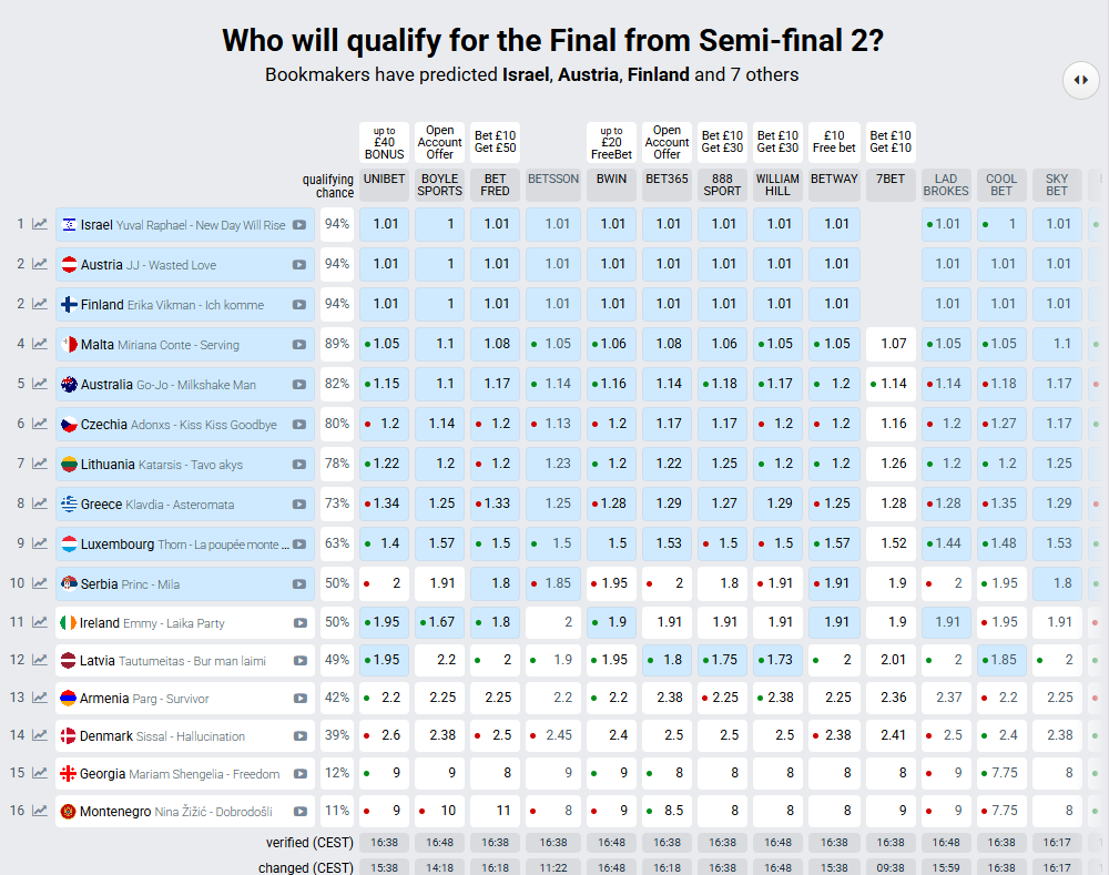 Ob tem velja dodati, da se gibanja na stavnicah lahko hitro spremenijo. Trenutno te najbolje kažejo Izraelu, Avstriji in Finski. Uvrstitev v finale napovedujejo tudi Srbiji.