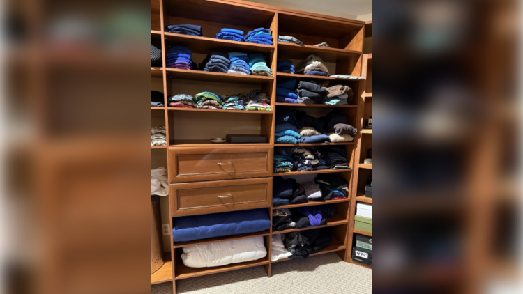 Na prvi pogled je prizor povsem vsakdanji: police omar, na katerih so zložena oblačila, a nekje med njimi se skriva puhasta kosmatinka, ki se je mojstrsko zlila z okolico. Nekateri uporabniki so jo opazili v hipu, drugi pa so potrebovali več časa.