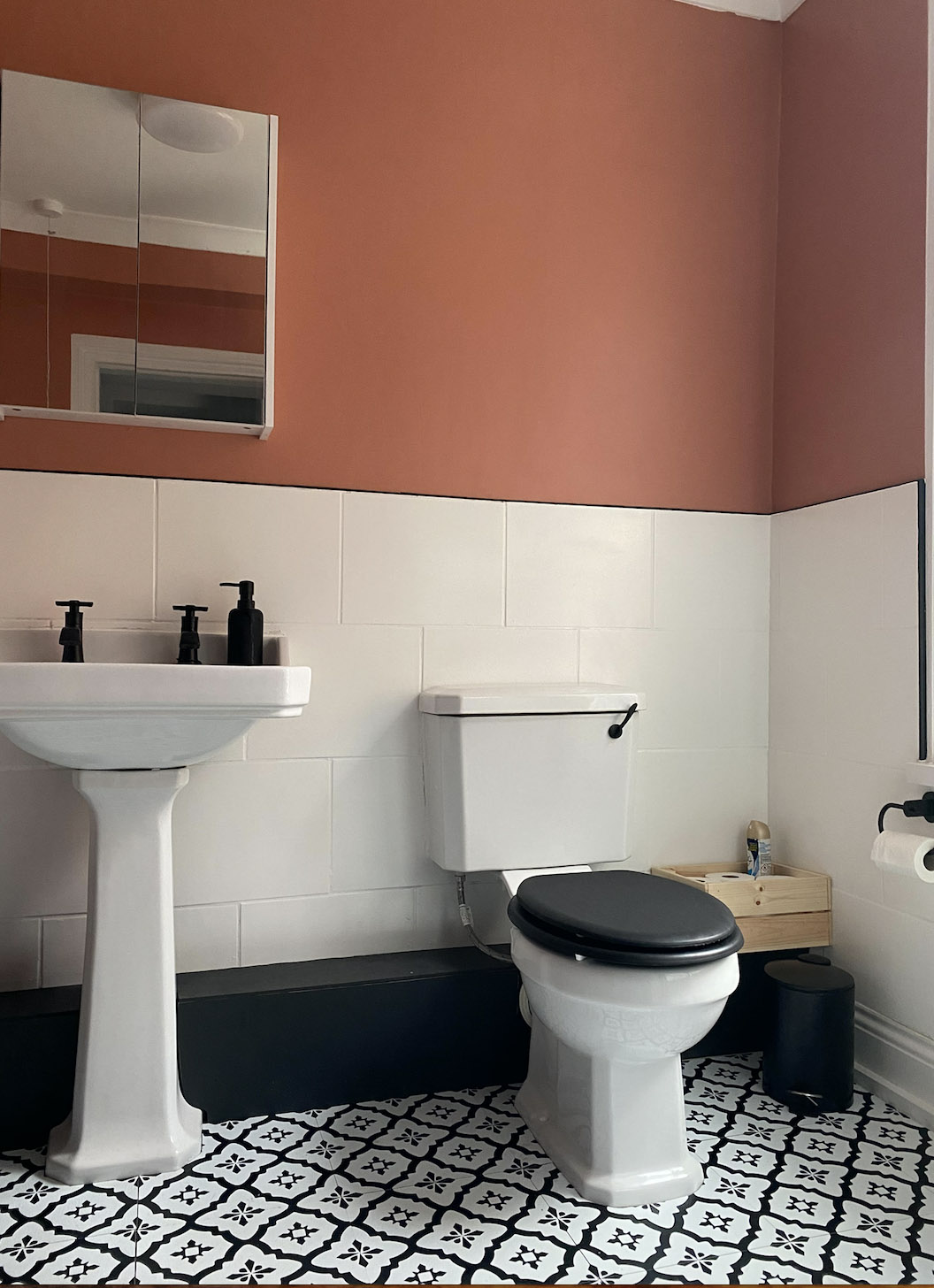 Jess je pobarvala ploščice, posprejala stenske elemente, stene pa osvežila s staro barvo, ki ji je ostala od prenove prejšnje hiše.