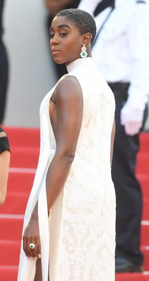 Lashana Lynch v beli obleki z detajli Fendi Couture.