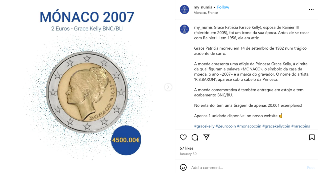 Eden takih je tudi kovanec za dva evra s podobo monaške princese Grace Kelly, ki ga je kneževina Monako izdala ob 25. obletnici njene smrti. Monako je skoval 20.001 kovanec za dva evra z njeno podobo. Od tega jih je bilo 20.000 poslanih v obtok, enega pa je v dar dobil njen sin, princ Albert II.