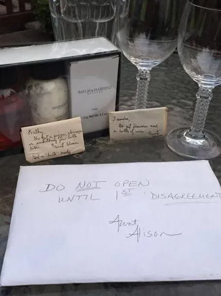 Kathy in Brandon Gunn iz Michigana sta se poročila septembra 2007. Na svoj poročni dan sta prejela kuverto od njene pratete (babičina ali dedkova sestra) Alison, ki jima je dejala, da vsebuje "ključ do rešitve zakona". Prateta jima je dala stroga navodila, naj kuverte ne odpreta, dokler ne doživita prvega resnega prepira. Kuverto sta odprla šele pred štirimi leti.