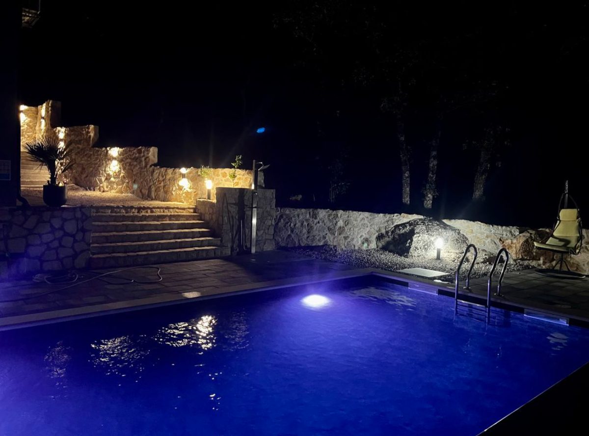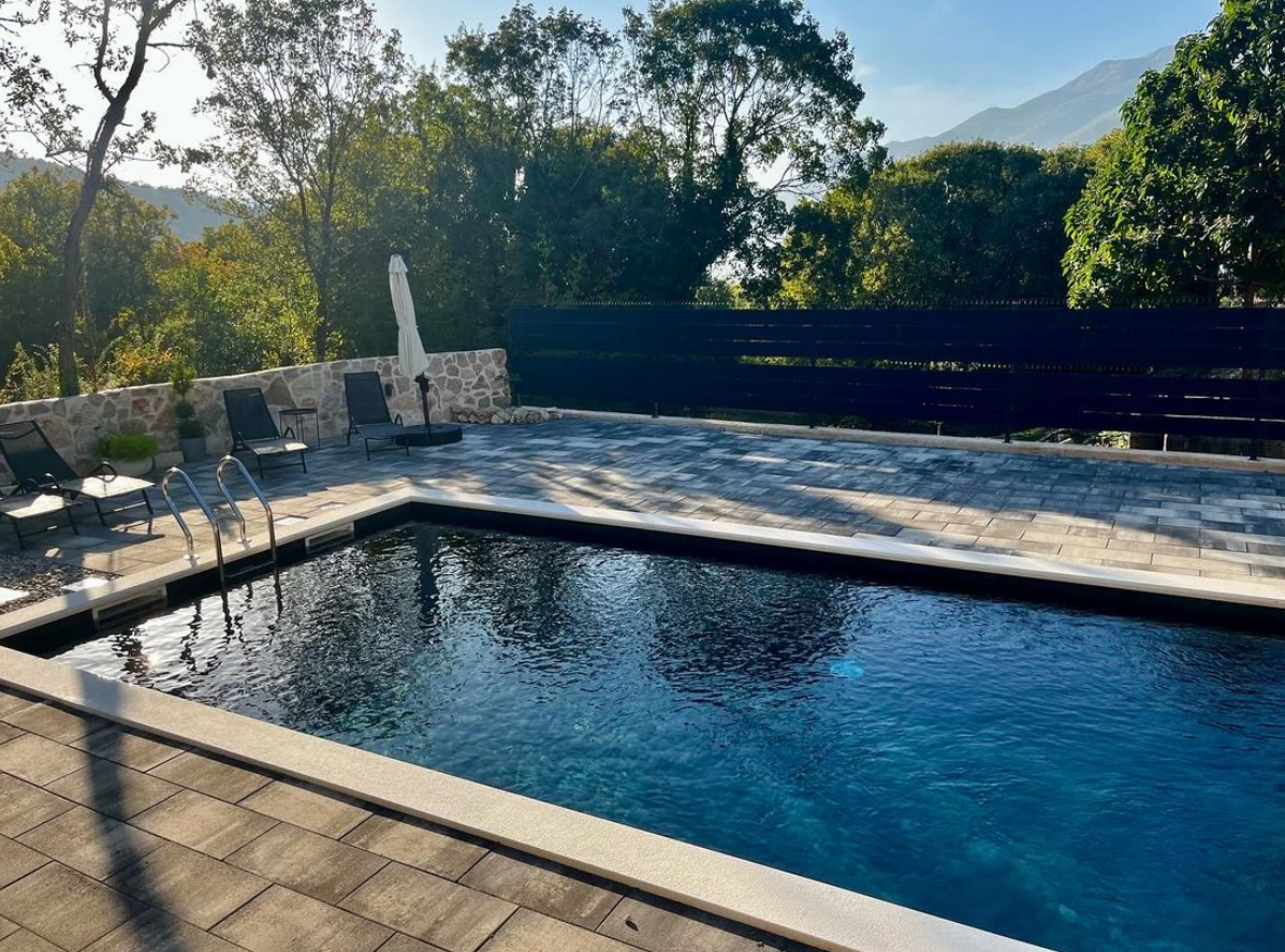 Kamnite stopnice s terase vodijo tudi do zunanjega bazena, ki je že napolnjen z vodo.