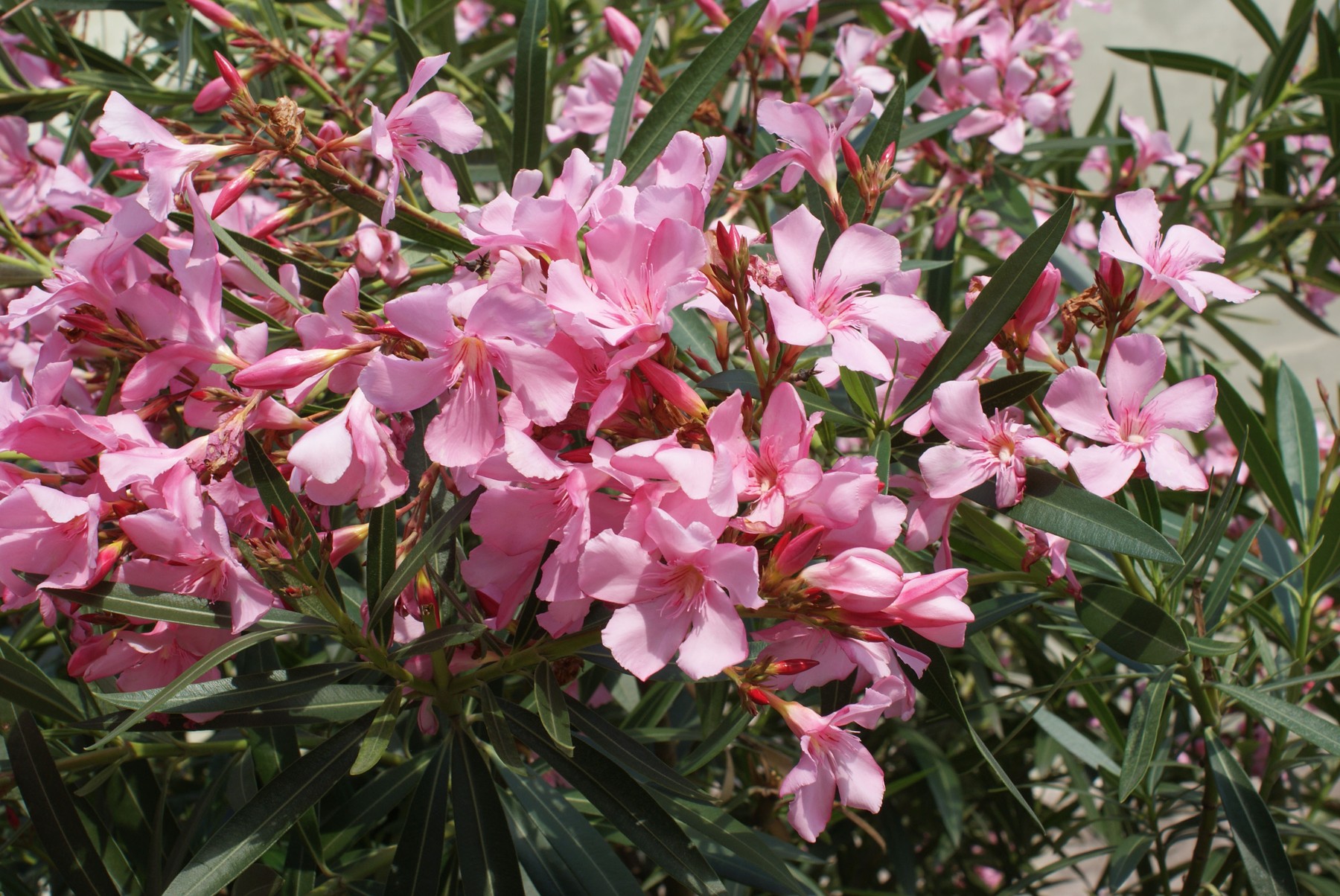 Navadni oleander (Nerium oleander) raste v obliki grma, in ga pogosto sadijo na vrtove in v parke. Listi so temno zeleni, dolgi do 15 centimetrov in koničasti, cvetovi so veliki in prijetno dišeči, rdeči, rožnati, rumeni ali beli. Listi, lubje in semena so še posebej bogati s strupenimi glikozidi in že relativno majhna količina lahko povzroči srčni zastoj. Cveti od junija do septembra.