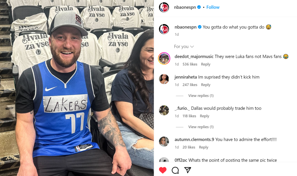 Navkljub jezi nad vodstvom kluba pa so Dončića navijači v dvorani sprejeli z odprtimi rokami. Eden od njih je postal prava spletna senzacija – njegov predelani dres, kjer je z lepilnim trakom prekril napis Dallas in ga zamenjal z Lakers, je postal simbol navijaške zvestobe Dončiću in obenem kritika kluba.