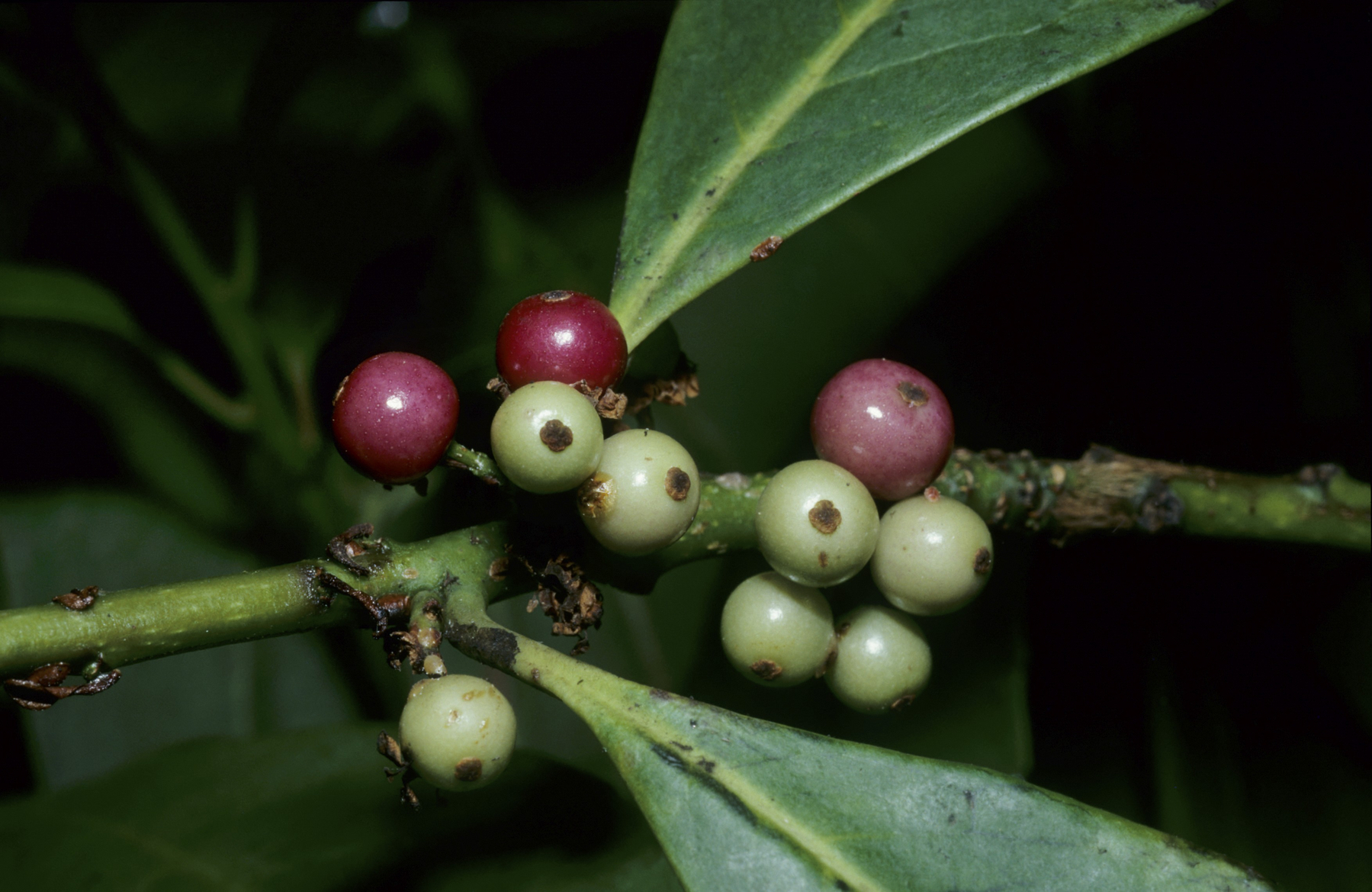 Listi grma so usnjati na otip in vsebujejo do 1,5 odstotka kofeina. Rastlina cveti od oktobra do decembra, njeni plodovi pa so rdeče jagode.