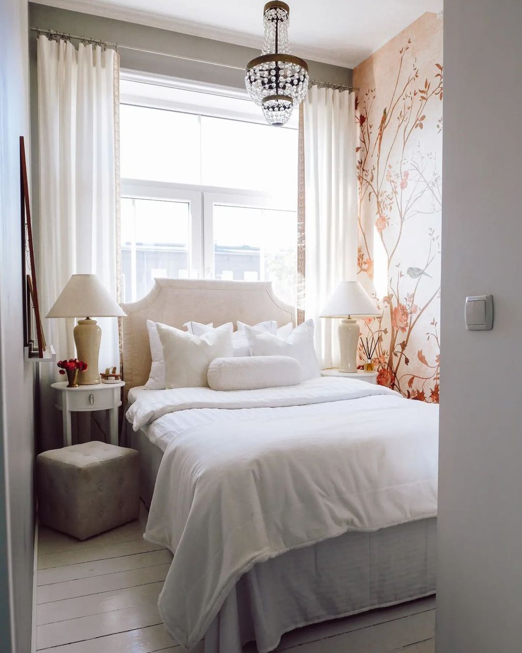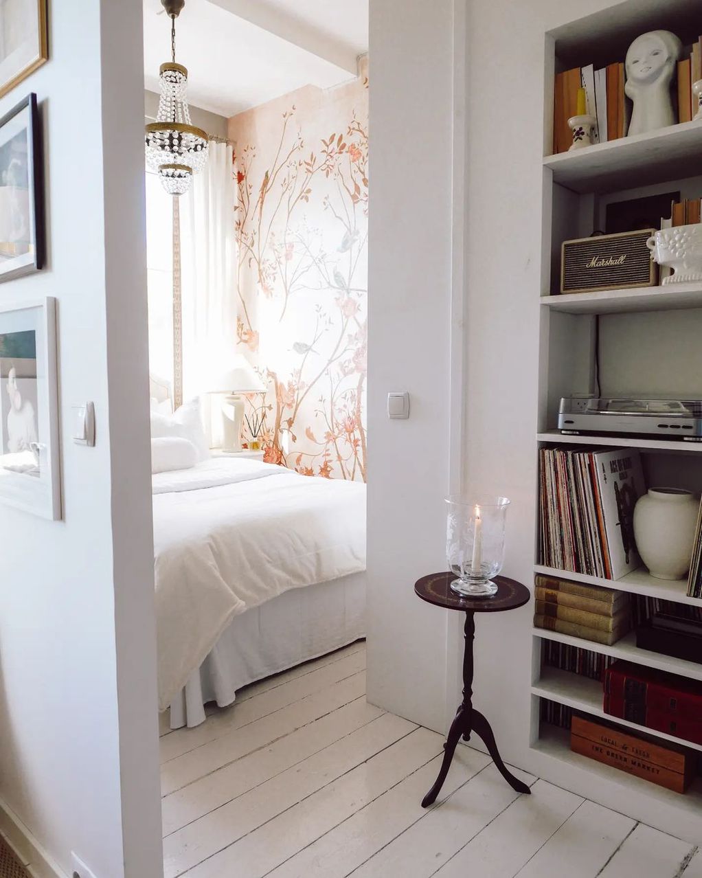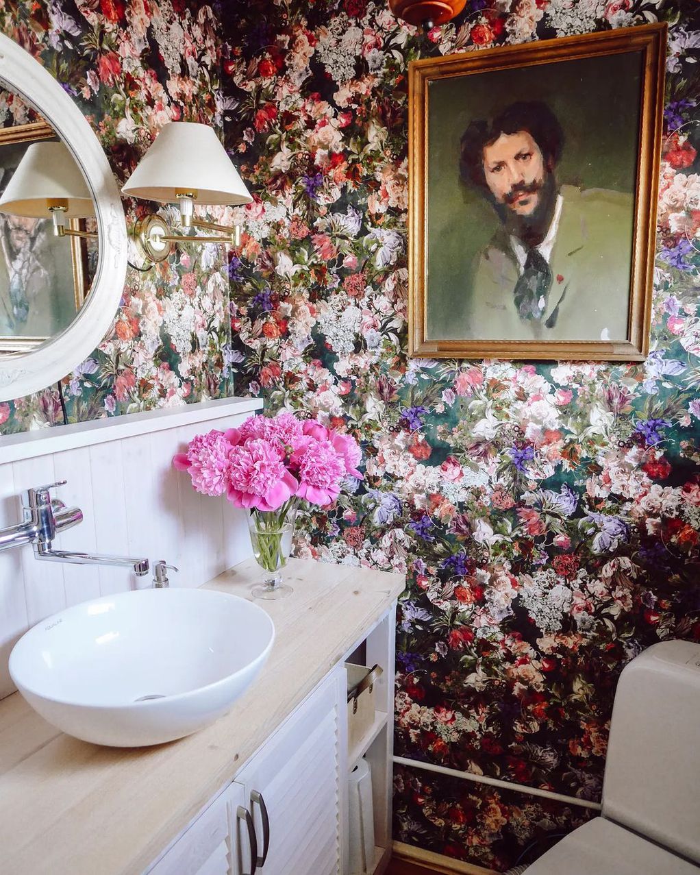 Na primer, s tapetami je ustvarila sodobno in toplo vzdušje. V spalnici je namestila oranžno tapeto, ki posnema gozd in ptice, v kopalnici pa čudovito cvetlično tapeto, ki ustvarja vtis renesančnega prostora, kakršnega lahko vidimo na starih umetninah.