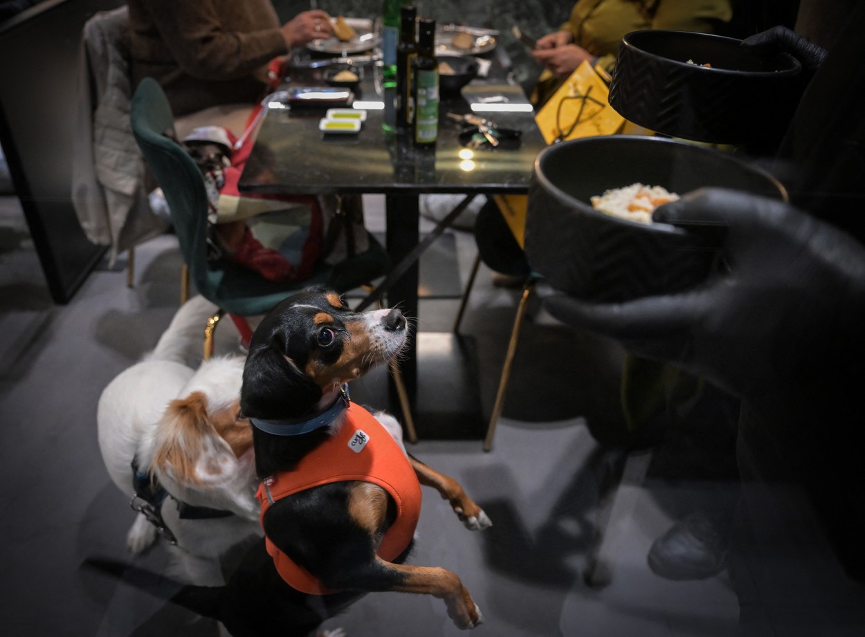 Lastnike in pse posedejo natakarji za isto mizo. Medtem ko ljudje sedijo na stolih, imajo za pse pripravljene posebne odeje. Ob pasjem meniju so navedene različne velikosti porcij, ki so primerne za različne velikosti psov. Za posebne priložnosti pripravijo tudi pasjo torto.