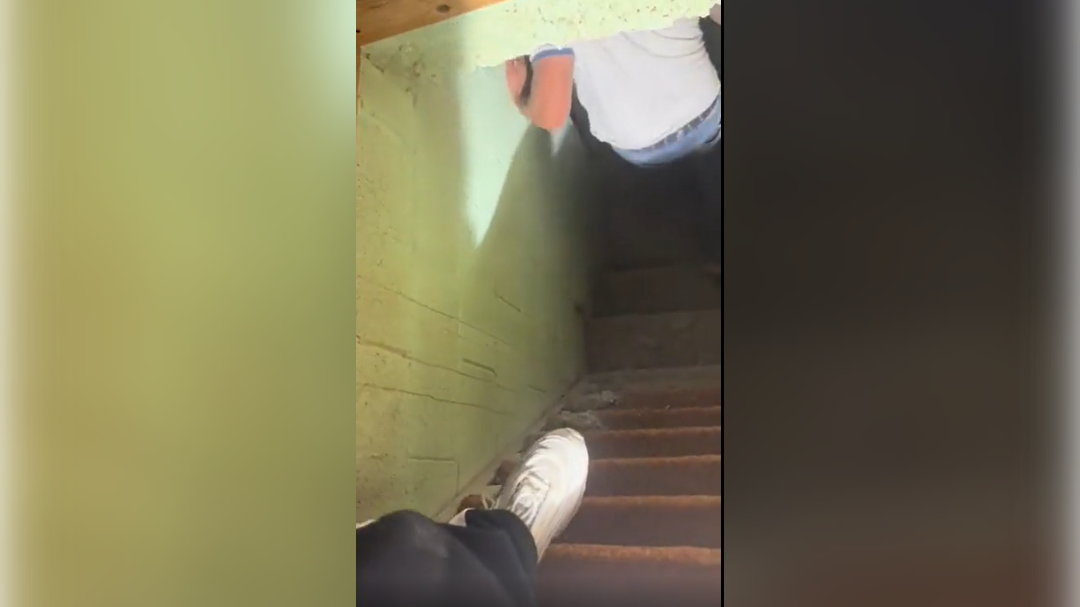 Moški se je previdno spustil v temno sobo, medtem ko mu je žena svetila pot. Posnetek razkriva prazno, a skrivnostno sobo z nenavadnimi sledmi na stenah.