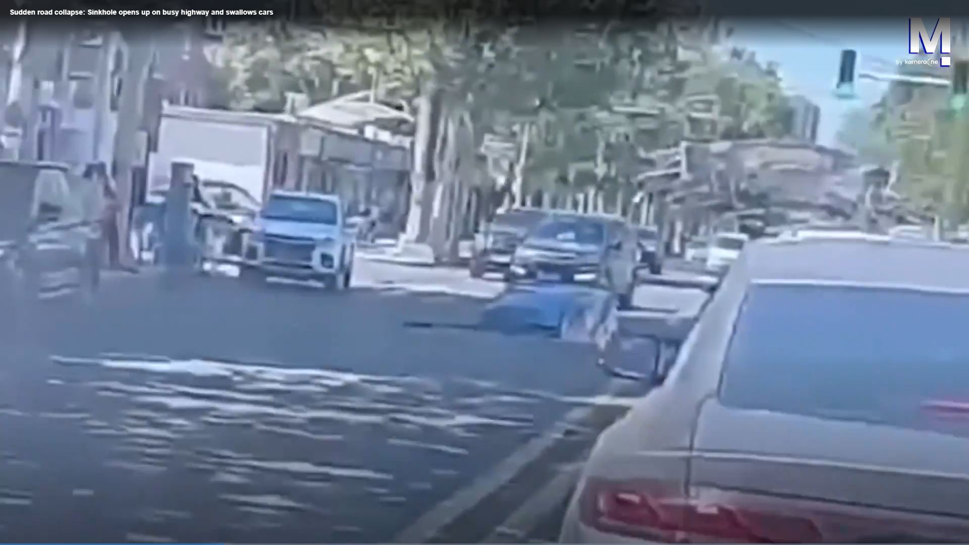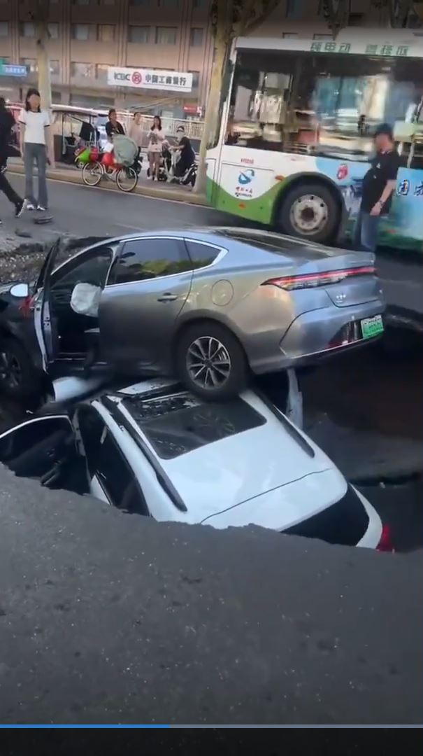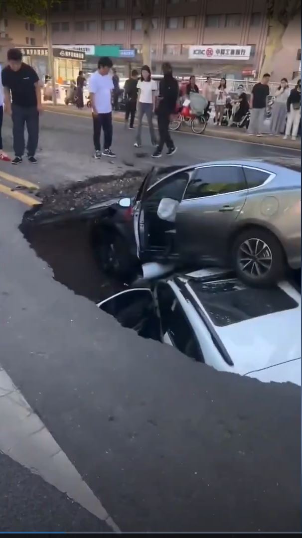 Posnetek nadzorne kamere prikazuje, vozili izgineta v luknjo na cestišču, na drugem posnetku, ki ga je posnel mimoidoči, pa je videti avtomobila, naložena drug na drugega, medtem ko vozniki in potniki plezajo iz ogromne jame.