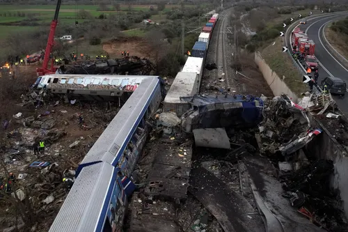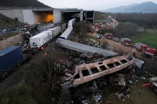 Na severovzhodu Grčije sta trčila dva vlaka, pri čemer je umrlo najmanj 43 ljudi, več kot 70 je ranjenih. Grški mediji poročajo, da gre za najhujšo nesrečo v zgodovini države. Pristojne oblasti so zaradi očitkov umora in hudih telesnih poškodb iz malomarnosti še isti dan aretirale postajnega načelnika v kraju Larisa, grška vlada pa je razglasila tridnevno žalovanje. Odstopil je minister za promet Kostas Karamanlis. Pred podjetjem Hellenic Train so se zbrali protestniki, ki so v okna metali kamenje.