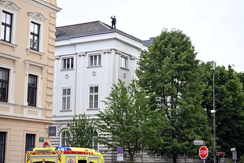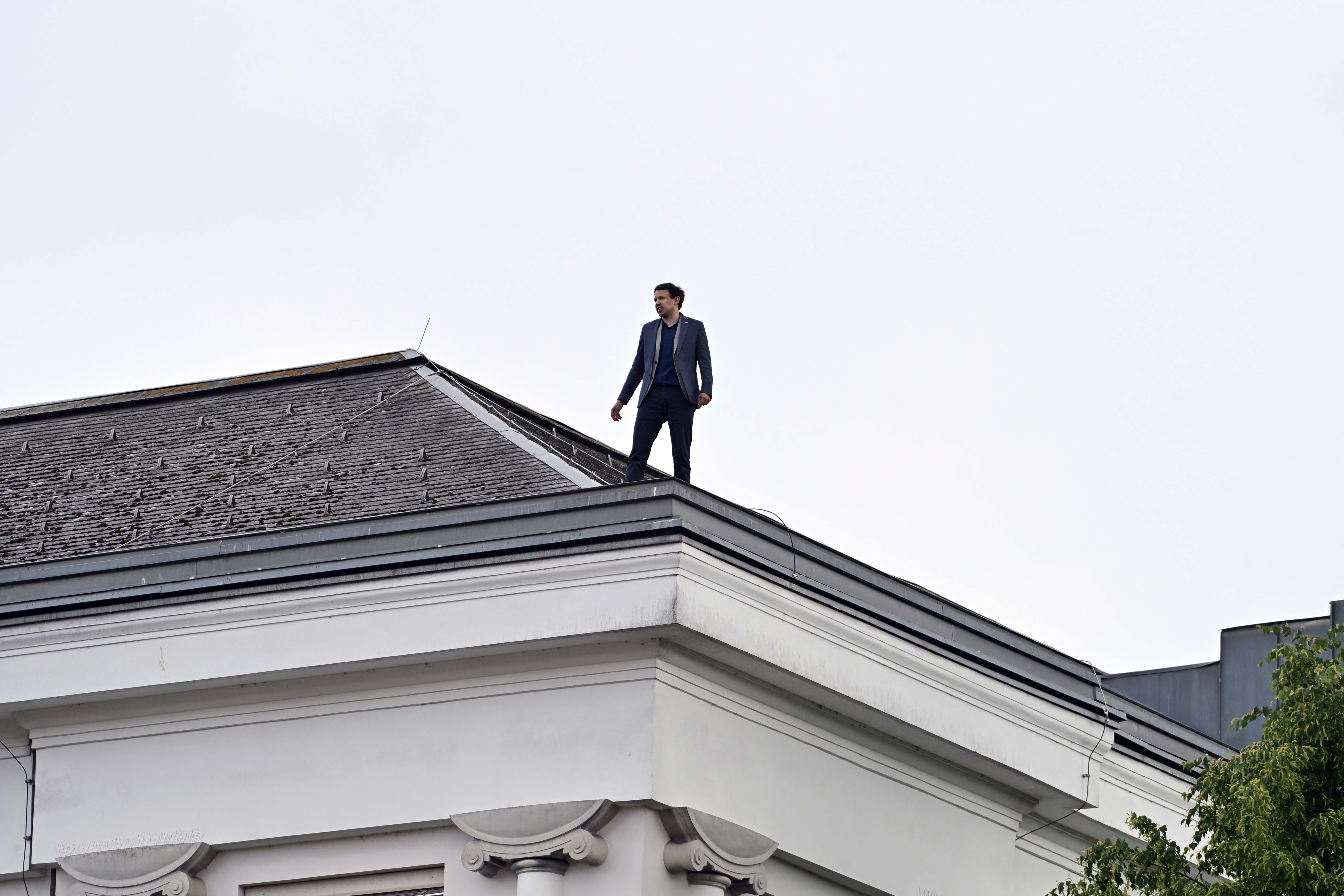 Pred državnim zborom je zaradi poslanca na strehi potekala intervencija. Tam so bili policisti, gasilci in reševalno vozilo. Poslanec, ki je grozil tudi, da bo s strehe skočil, je ob pomoči gasilcev medtem s strehe že sestopil.