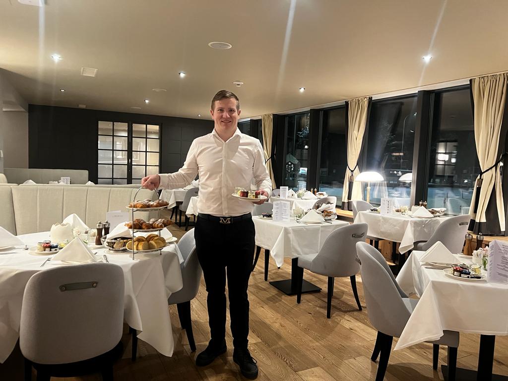 Do 17.00 sem prost, ta čas pa izkoristim za sprehod okoli Davoškega jezera, se slišim z domačimi, posnamem kakšen TikTok. Vedno je treba še kaj postoriti, tako da odmor nikoli ni predolg. Pred začetkom drugega dela izmene grem na večerjo. Ob 17.30 se vrnem v restavracijo, kjer se seznanimo z aktualnim menijem in posebnostmi hrane gostov. Zatem sledi priprava miz, nato postrežemo večerjo. Med večerjo točimo gostom vino – tega namreč nikoli ne počnejo sami – prinašam hrano, odnašam posodo in podobno. Večino dela opravim v dveh urah, po odhodu zadnjih gostov pa mize v restavraciji pospravimo in jih pripravimo za zajtrke, ki bodo postreženi naslednji dan.