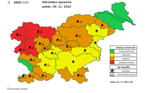 Danes zvečer in ponoči bodo reke začele močno naraščati, sprva na severozahodu, kasneje pa tudi drugod po Sloveniji. Reke v Posočju, na Idrijsko–Cerkljanskem, v porečju Sore, Save Bohinjke in Save v srednjem in zgornjem toku bodo poplavljale. Na celotnem območju severozahodne Slovenije in delu osrednje Slovenije ter ob obali so verjetne poplave hudourniških vodotokov in zaledne padavinske vode. Poplavljanje rek je možno tudi na Vipavskem, Savinjskem in na Koroškem.