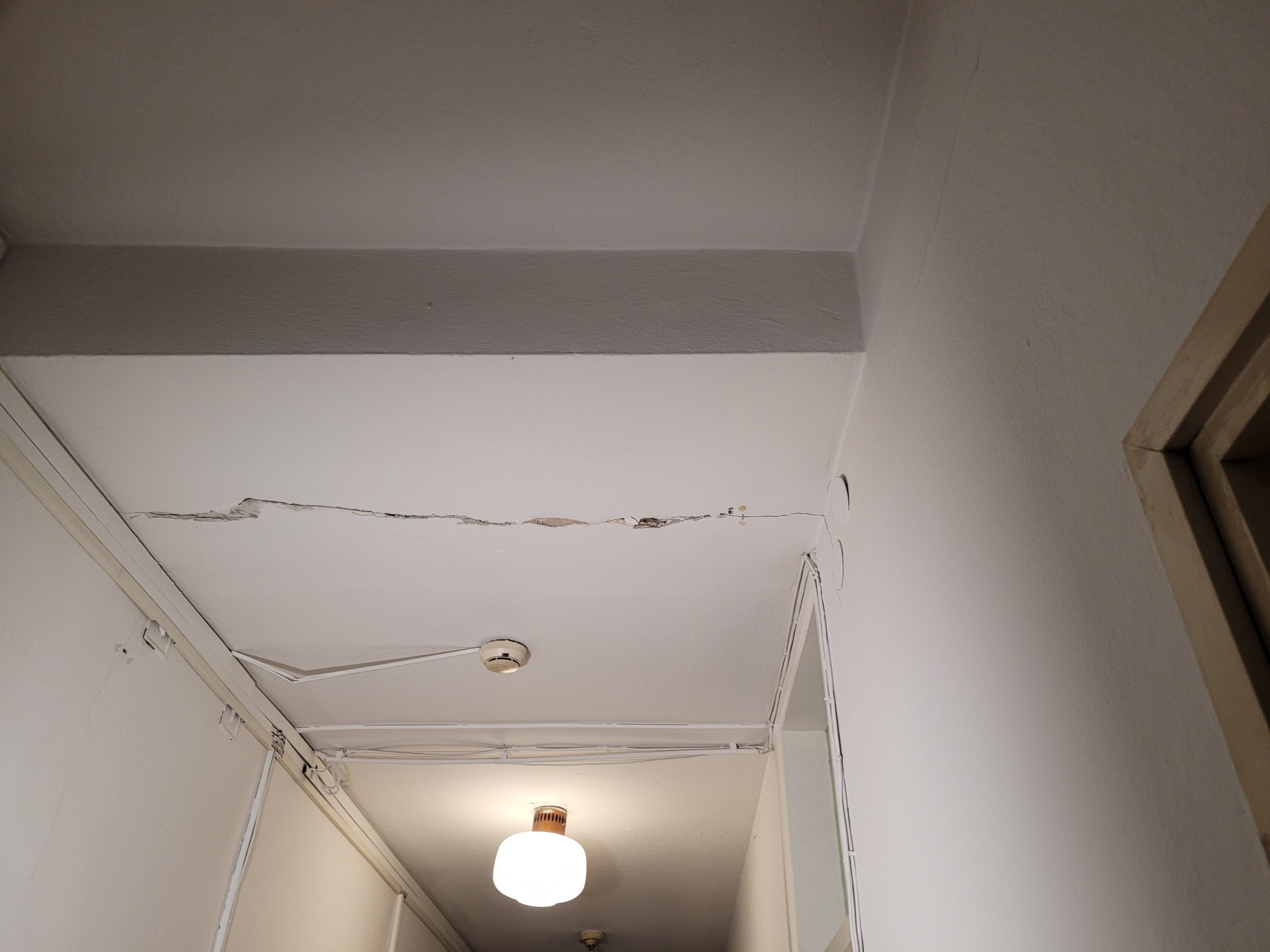 "Ugotavljamo, da se prizidek poseda. V tej razpoki v steni vidite vstavljene merke, saj tu od leta 2004 Gradbeni inštitut ZRMK izvaja meritve in o stanju izdaja redna poročila. Po enem od nedavnih potresov na Hrvaškem se je izkazalo, da se je vse skupaj malo premaknilo. Odpada tudi omet. Malo nas je strah, kaj bi se zgodilo ob večjem potresu." Razpoka sega do kleti, v 3. nadstropju, ki je najbolj izpostavljen del, je le najbolj vidna.