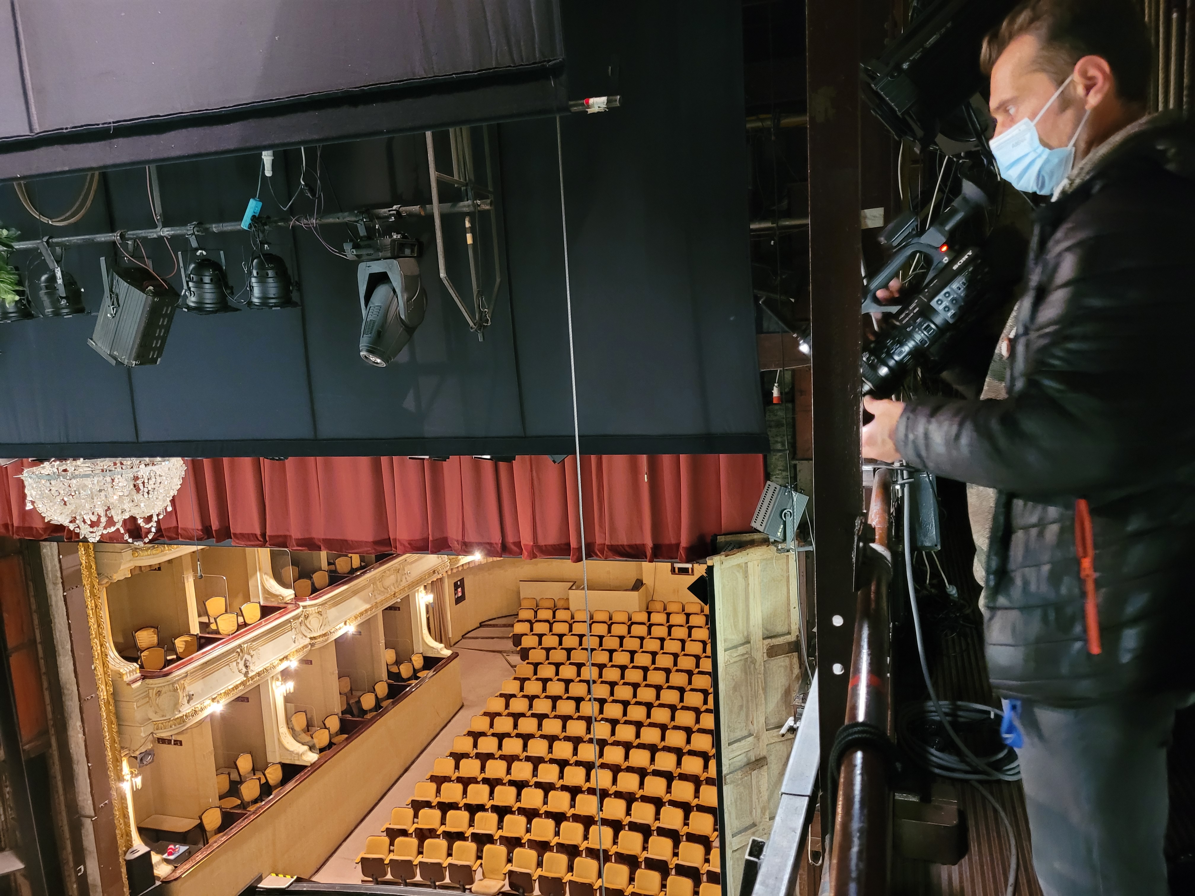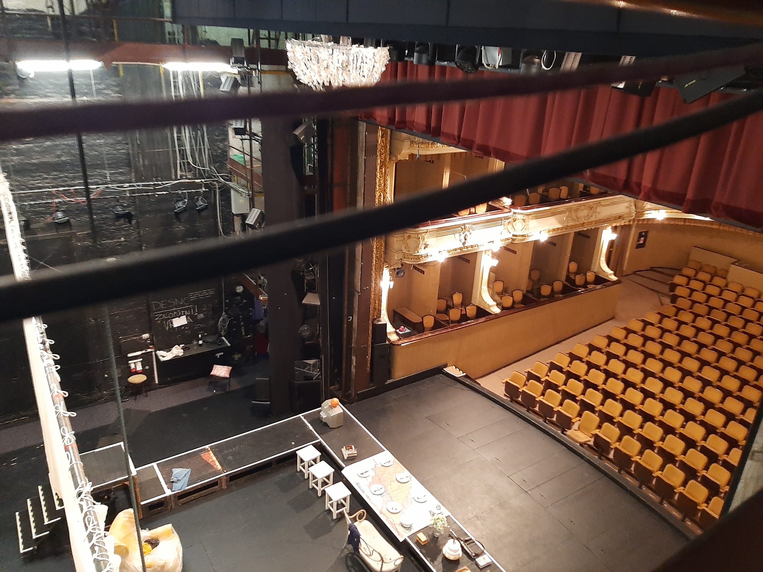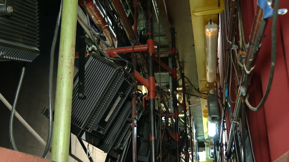 Dolgoletni tehnični vodja gledališča, ki pozna vsak kotiček stare stavbe, nas nato odpelje v 'odrski stolp', prostor nad odrom velike dvorane, kamor obešajo luči in scenske elemente. Železna konstrukcija je iz leta 1911. "Videti je stabilna, ne vemo pa, kaj se dogaja znotraj, kako utrujeni so že materiali," pravi.