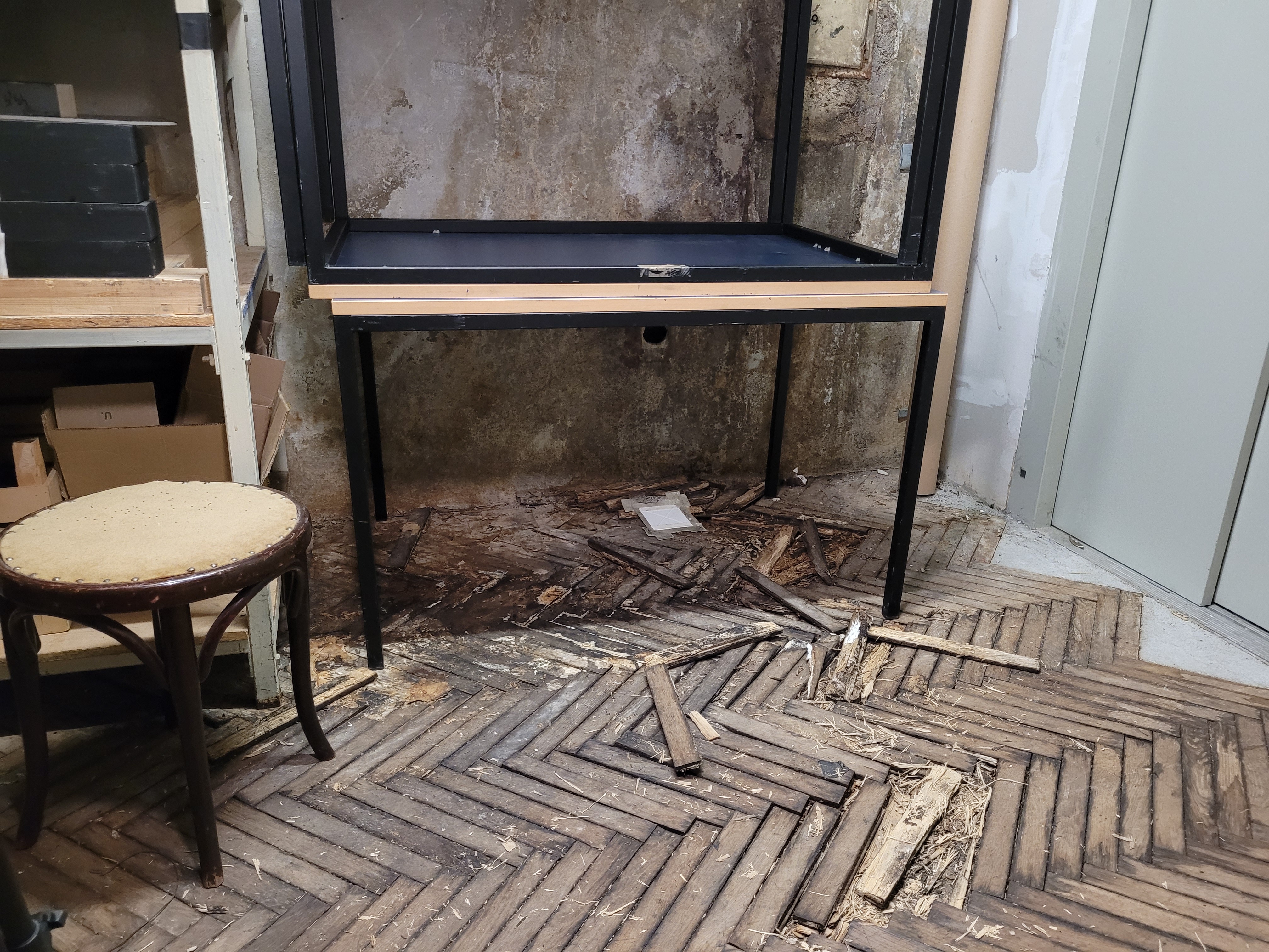 "Ob vsakem večjem nalivu kaplja na oder," razmere opisuje Vadnjal. "Odvisno od moči naliva kaplja, curlja ali teče. Zalije tudi tapetniške delavnice."