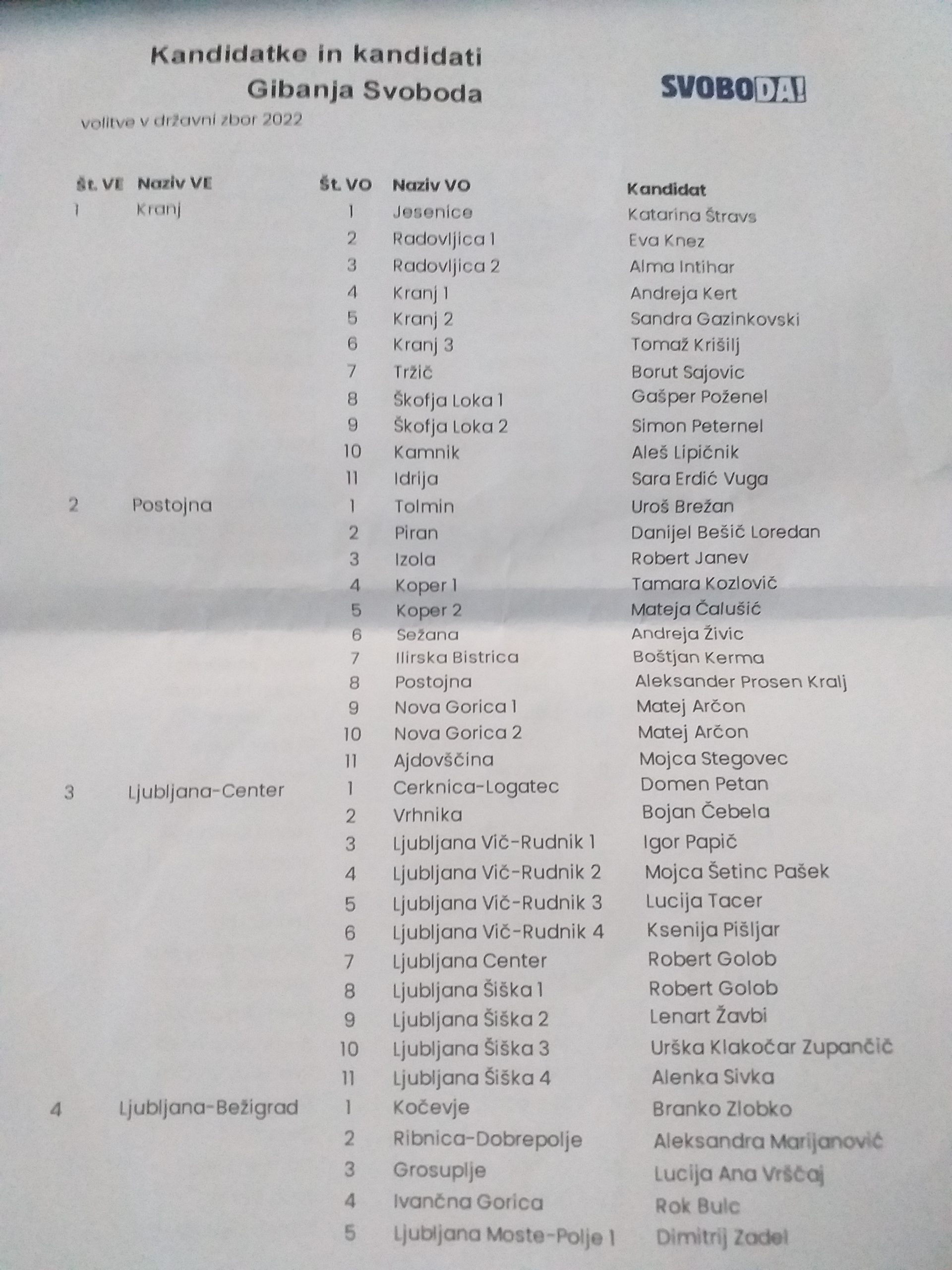Glede adutov stranke na aprilskih volitvah so bili v Gibanju Svoboda dolgo skrivnostni. Zdaj je jasno, da bo Golob kandidiral v dveh ljubljanskih okrajih (Center in Šiška 1), generalni sekretar stranke in bivši župan Nove Gorice Matej Arčon pa v obeh novogoriških okrajih. V ljubljanskih volilnih enotah se bodo za poslansko mesto poleg Goloba potegovali še podpredsednica stranke in nekdanja ljubljanska sodnica Urška Klakočar Zupančič, izvršna direktorica Slovenske filantropije Tereza Novak, strokovnjak za jedrsko varnost Miroslav Gregorič, bivši rektor ljubljanske univerze Igor Papič, nekdanja poslanka SAB Mirjam Bon Klanjšček, zgodovinar Martin Premk, novinarki Mojca Šetinc Pašek in Alenka Sivka, bivši prvi mož Luke Koper Dimitrij Zadel … Poslanca iz nepovezane poslanske skupine Janja Sluga in Jurij Lep bosta kandidirala v domačih volilnih okrajih Celju in Rušah. Nekdanji boksar Dejan Zavec se bo v tekmo za naklonjenost volilcev podal na domačem Ptuju … Ob današnji predstavitvi kandidatov je bil Zavec deležen zelo glasnega (če ne celo najglasnejšega) aplavza. Kot nam je dejal, se je za Gibanje Svoboda odločil, saj je to najbolj realna stranka. Kot pomembno je izpostavil, da se v politiki "začnejo pogovarjati na nivoju in spoštljivo".