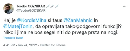 Teodor Goznikar, ki je po neuradnih podatkih osumljen pošiljanja grozilnih pisem vidnim politikom, se je pogosto pojavljal ob predsedniku SNS Zmagu Jelinčiču. Skupaj sta položila venec ob Titovem spomeniku in potovala v BiH in na Dunaj. Goznikar je sodeloval tudi pri poslu za dobavo ograje za južno mejo. Decembra je odstopil z mesta poveljnika civilne zaščite v Celju. Župan Bojan Šrot nam je dejal, da z njim ni bil zadovoljen.