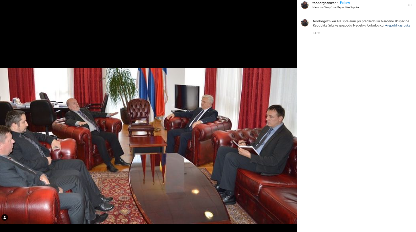 Fotografija na začetku članka je z žrebanja vrstnega reda kandidatnih list za evropske volitve leta 2019. Na žrebanju je SNS zastopal Goznikar. Spodaj so fotografije, na katerih sta Jelinčič in Goznikar. Ena je s kongresa SNS leta 2017, druga z maja 2019, ko sta na vrtu ob Jelinčičevi hiši položila venec ob kipu Josipa Broza Tita. Tretja je s srečanja s predsednikom narodne skupščine Republike Srpske Nedeljkom Čubrilovićem, četrta, kot je ob fotografiji napisal Goznikar, pa s srečanja s takratnim predsednikom kazahstanske narodne skupščine.