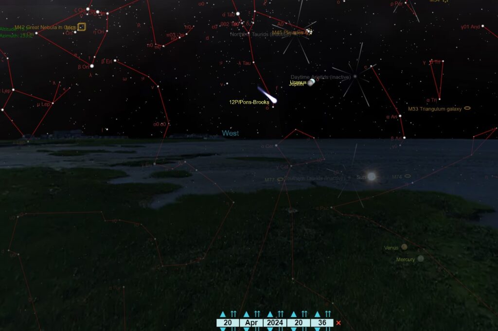 Uradno znan kot komet 12P/Pons-Brooks, premera približno 10,5 kilometra, bo iz naših krajev najbolje viden kmalu po sončnem zahodu. Če boste kakšne pol ure po zahodu sonca pogledali skoraj točno na zahod, boste komet lahko opazili nizko nad obzorjem, malce levo spodaj pod Jupitrom, ki ga lahko prepoznate po tem, da je precej svetlo nebesno telo oziroma precej velika "zvezda" na nočnem nebu.