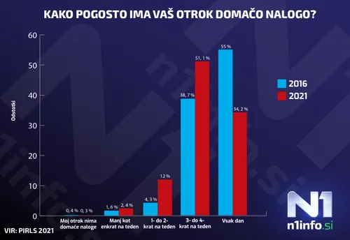 Za dobrih 8 odstotnih točk se je povečal tudi delež staršev, ki pravijo, da ima njihov otrok domačo nalogo enkrat do dvakrat na teden. "Skratka, pogostost domačih nalog se je, po mnenju staršev četrtošolcev, zmanjšala," je še dejala.