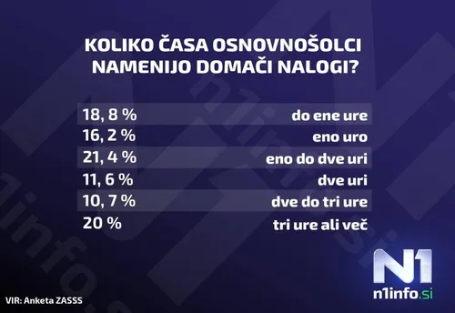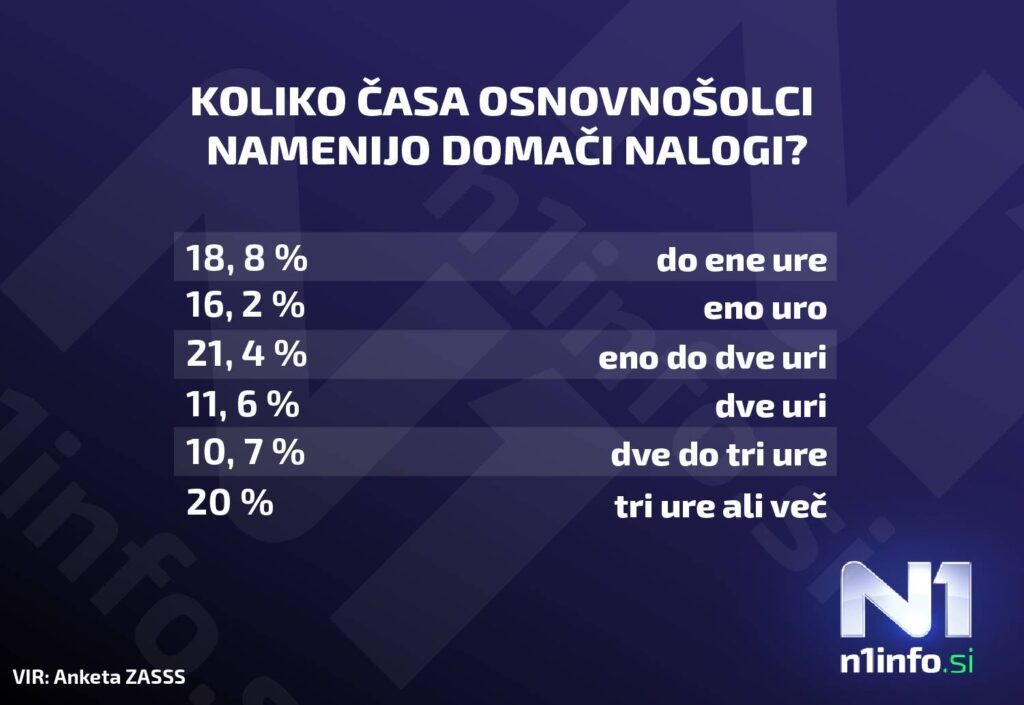 "Lahko bi rekli, da učenec v zadnji triadi za domače naloge porabi povprečno slabo uro na dan, sta pa tu seveda še učenje in izdelava posebnih nalog. Dnevno lahko učenci šoli posvetijo več ur." Letos poleti so izvedli tudi anketo, ki je pokazala, da več kot 20 odstotkov osnovnošolcev za domačo nalogo porabi od ene pa dveh ur na dan. Podrobnejši rezultati ankete so v spodnji tabeli.