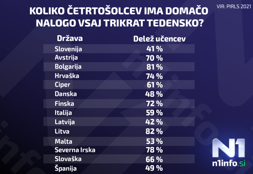 "To je skupno 13 izobraževalnih sistemov od vključno 23 sodelujočih v raziskavi," je pojasnila M. Klemenčič. Drugod so ti deleži manjši, na Nizozemskem denimo pa učencev, ki bi domače naloge dobivali trikrat ali večkrat na teden, dejansko ni.
