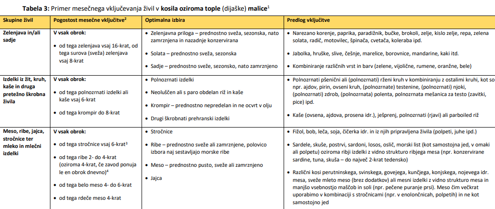 V spodnji tabeli so napisane skupine živil, iz katerih naj bi sestavili kosilo. Številke so preračunane za 20 kosil mesečno.