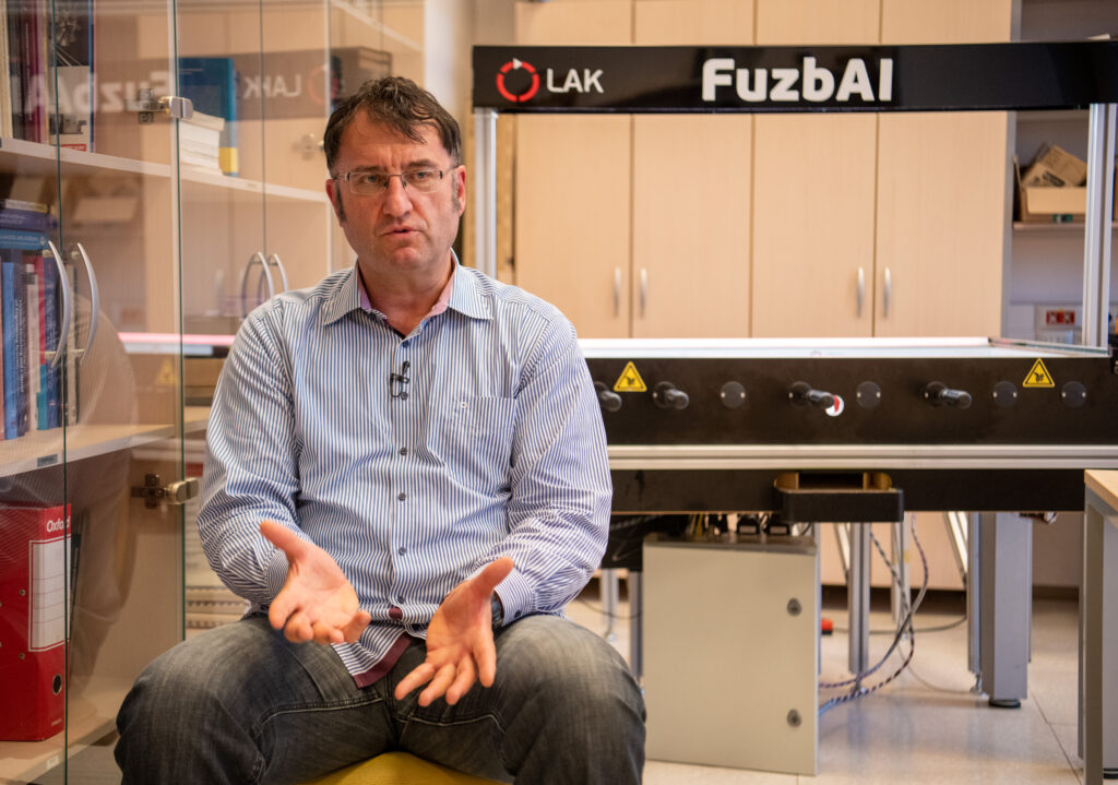Ena od najzanimivejših naprav v vašem laboratoriju je FuzbAI, miza za ročni nogomet, kjer smo na eni strani živi ljudje, na drugi pa avtomat. Kako deluje?