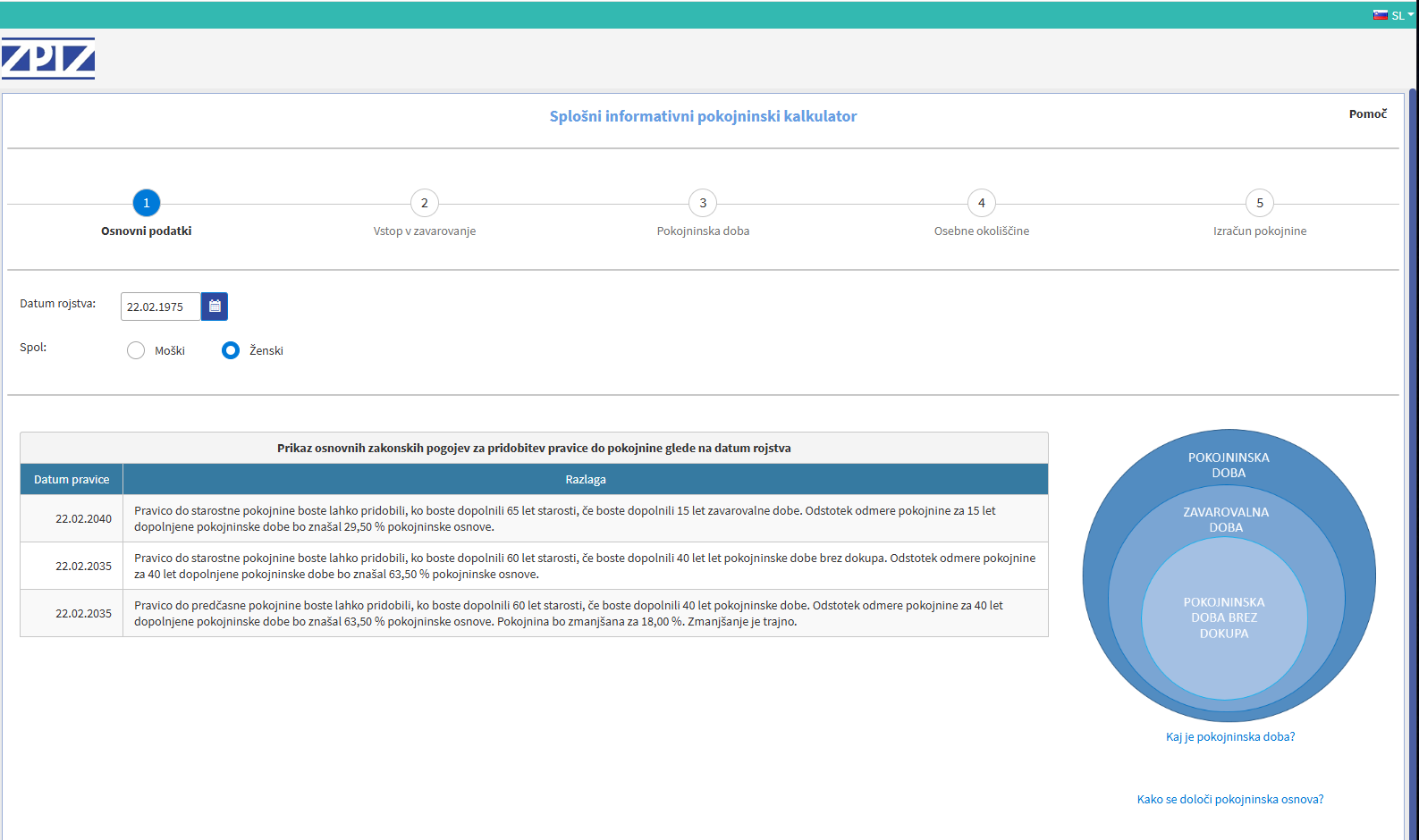 Najhitreje boste informativni izračun dobili z uporabo splošnega informativnega pokojninskega kalkulatorja na spletni strani Zpiz. V spletni obrazec vnesete osebne podatke in takoj zatem vam kalkulator poda različne možne datume upokojitve (na spodnji fotografiji).