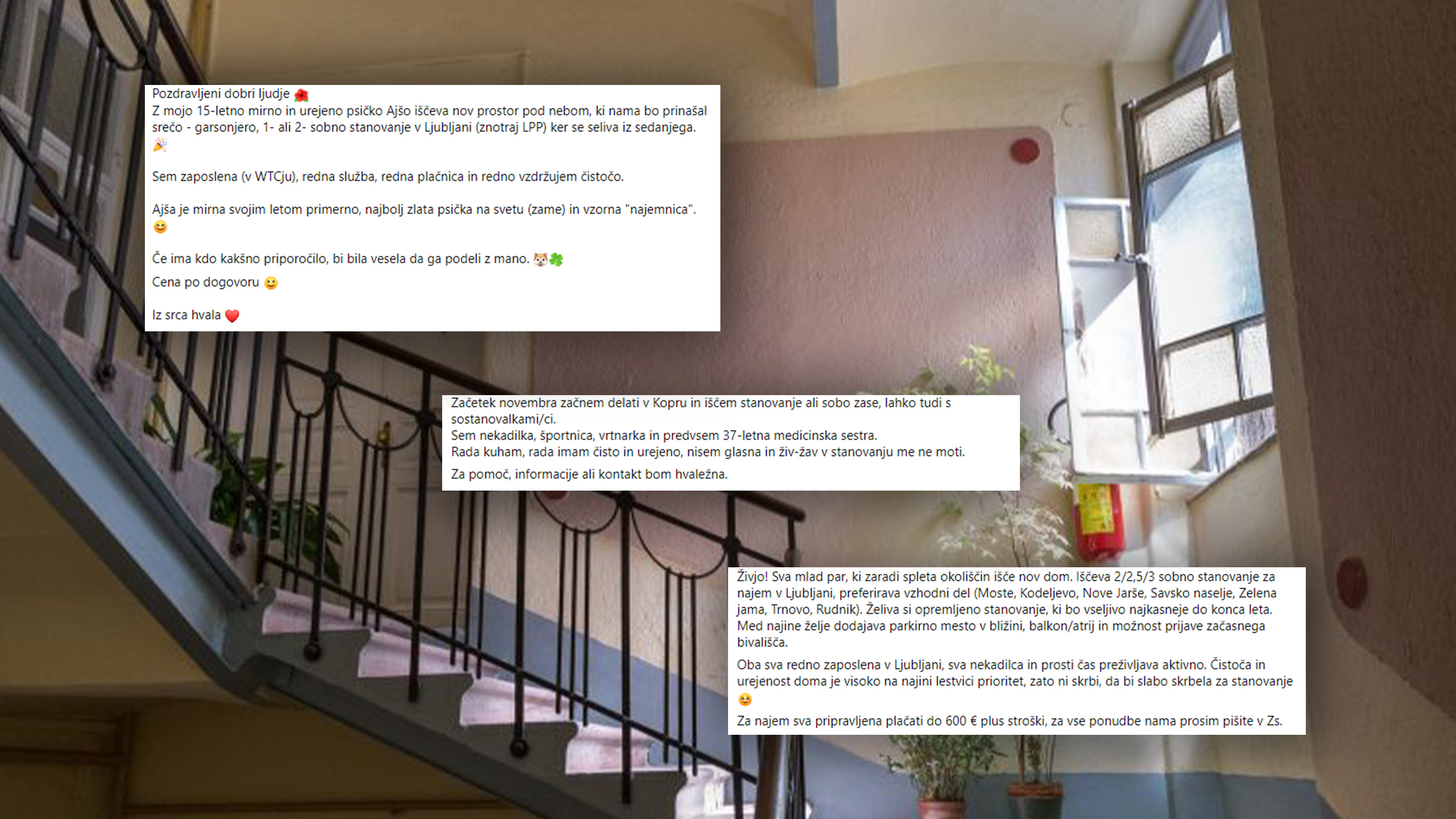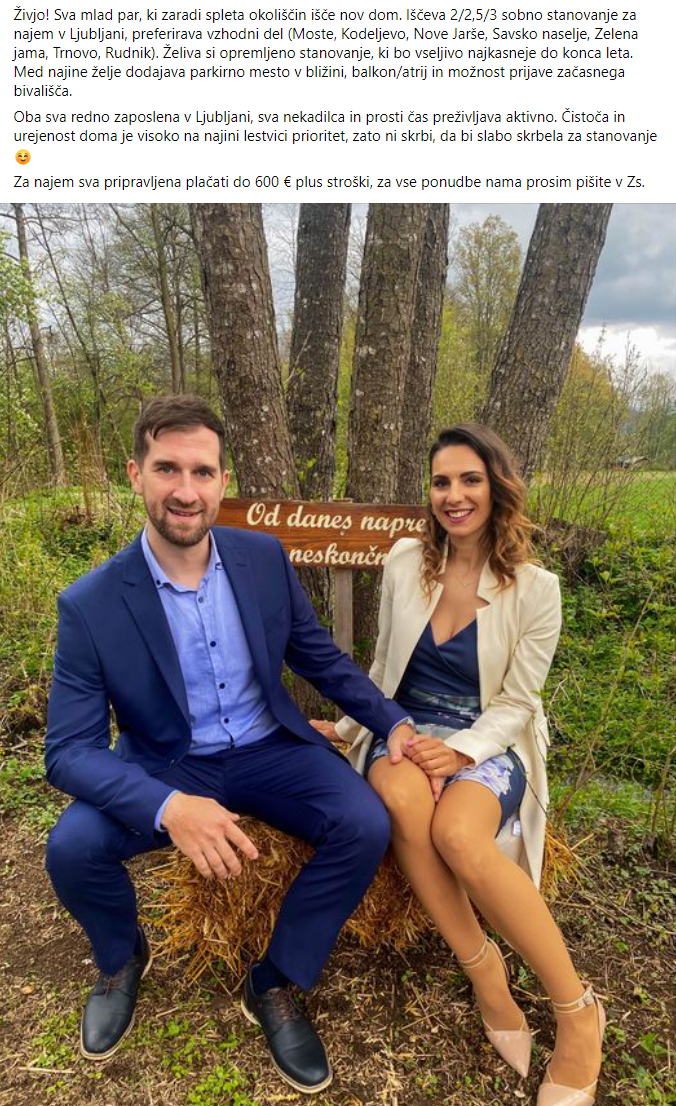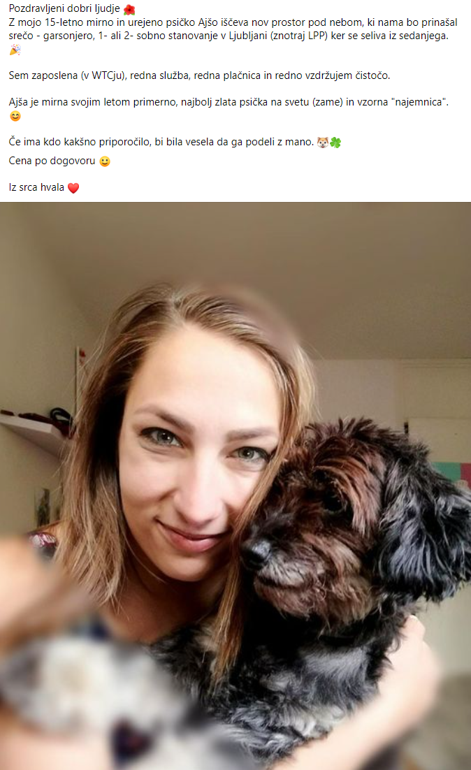 Tak oglas je med iskanjem stanovanja v priljubljeni skupini na Facebooku "Stanovanjce, stanovanjce, kje si?" objavila tudi SanelaKšela. "Najprej sem iskala primerna stanovanja preko spletne strani nepremicnine.net in v omenjeni skupini na Facebooku. V dveh tednih sem kontaktirala pet najemodajalcev, pri čemer mi tri stanovanja niso odgovarjala, pri dveh pa sem žal dobila odklonilen odgovor na vprašanje, če bi lahko z mano prebivala psička. Nazadnje sem se odločila za lastno objavo, s katero sem poskušala prikazati svojo prijazno (in tudi profesionalno) plat ter z opisom prepričati potencialne najemodajalce, da sva obe odgovorni, čisti, mirni in podobno," nam je zaupala.