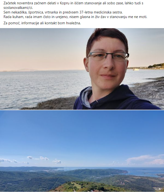 "Za objavo svoje poizvedbe sem se odločila, ker sem iskala dolgoročni najem in sem želela nagovoriti tudi tiste, ki morda raje sami najdejo najemnico oziroma najemnika, ki jih nagovori. Odziva ni bilo veliko, a ena resna ponudba mi je dala več zadoščenja, kot če bi klicalo deset neresnih ponudnikov," je za N1 opisala IlonaJerič, ki je stanovanje v omenjeni skupini iskala že drugič. Primeren dom je sicer našla na manjšem portalu, ki zajema razpoložljive nepremičnine na Primorskem. "Poskusila sem in imam občutek, da je to malo povečalo možnosti, da najdem to, kar sem iskala. In sicer zato, ker sem ljudi nagovorila na način, ki sem ga izbrala sama. Pri najemu stanovanja mi je namreč pomembno, da je na obeh straneh odnosa že od začetka določeno zaupanje in simpatija," pravi.