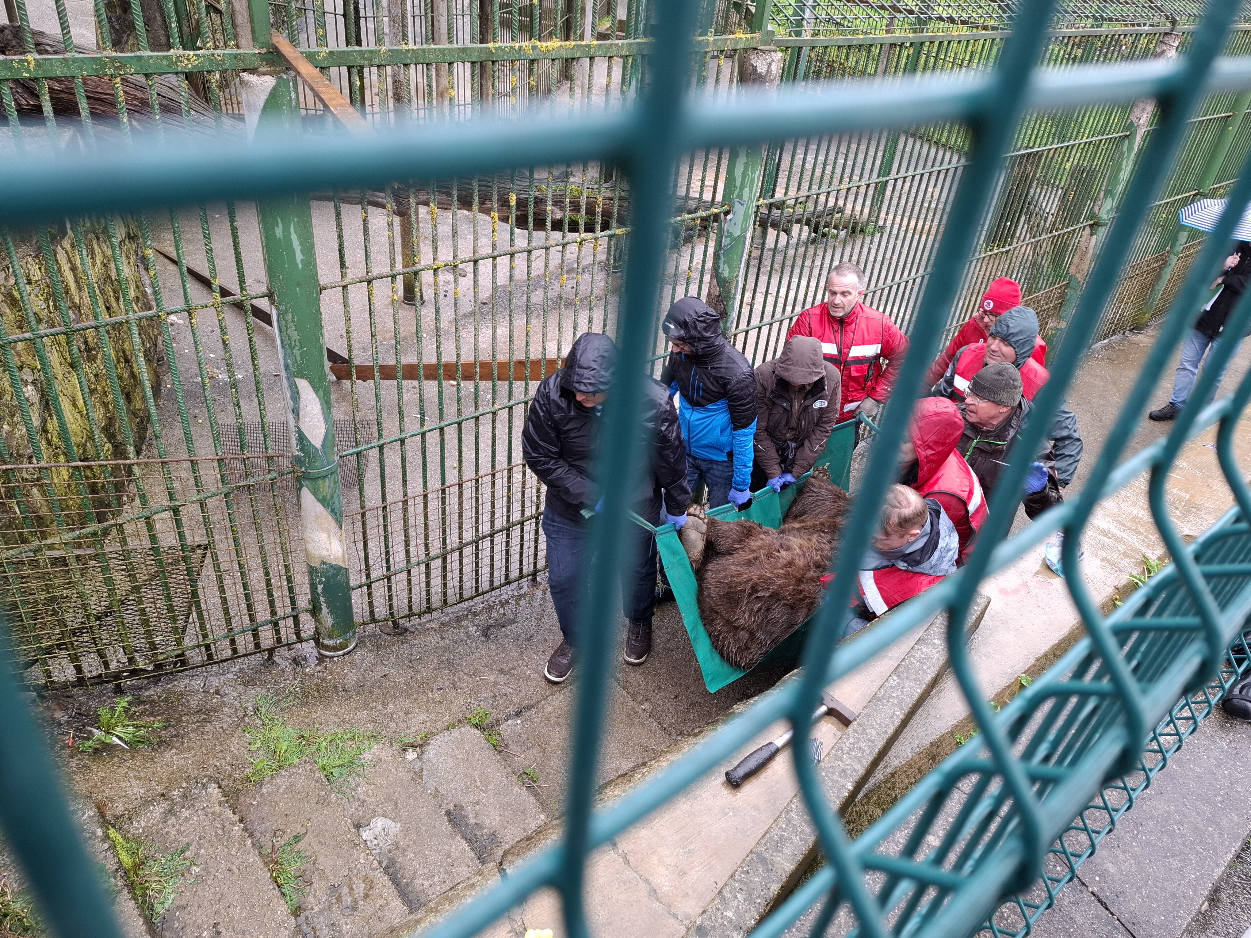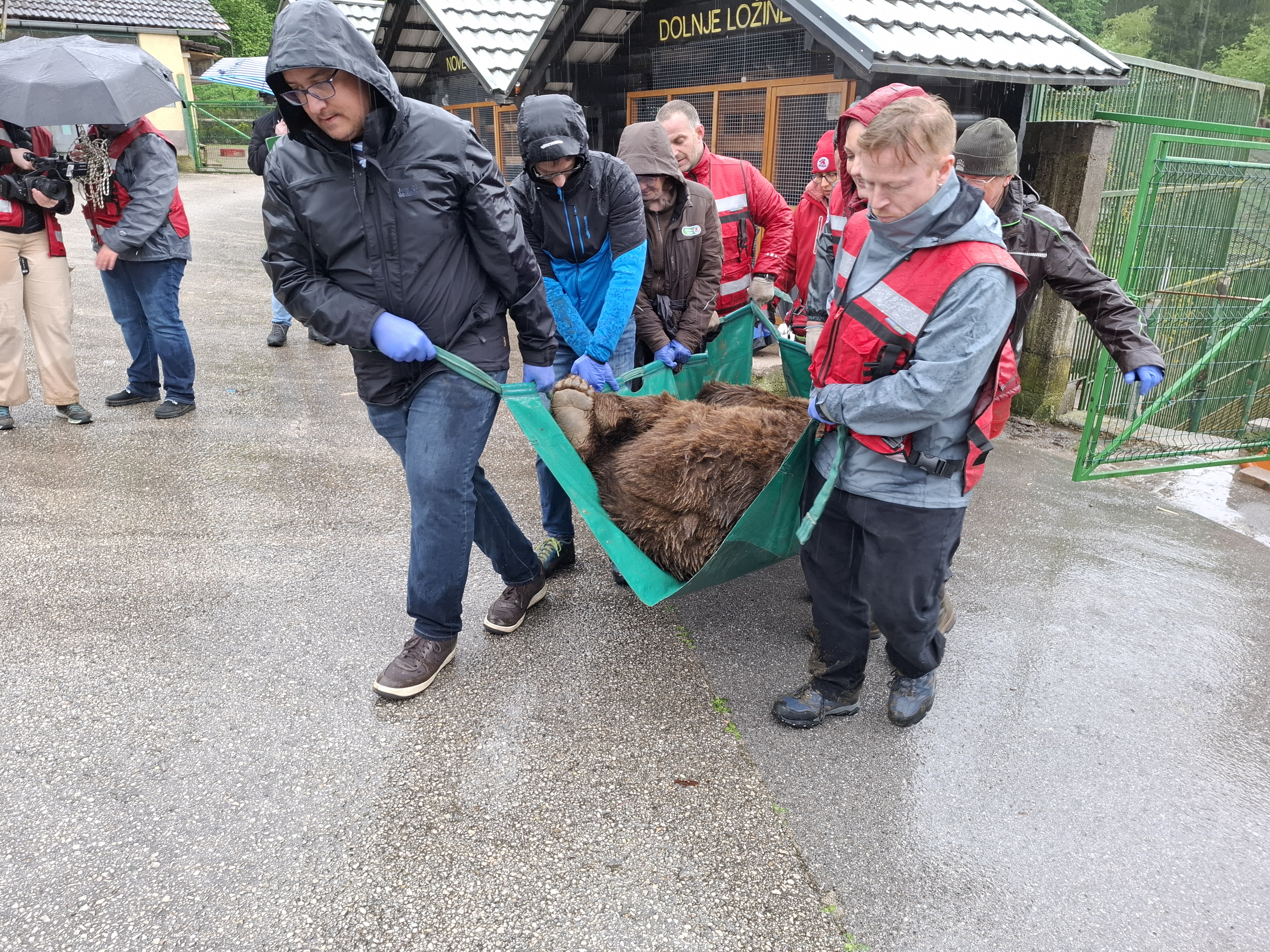 Več kot 300-kilogramskega medveda so nato premestili na cerado in ga prenesli v vozilo organizacije. Tam so mu odvzeli kri in ga veterinarsko pregledali. Dozdajšnja lastnica medveda in gostilne Tušek je premestitev spremljala z žalostjo, a ni želela dajati izjav. Medved je bil 34 let zaščitni znak njihove gostilne in del družine.