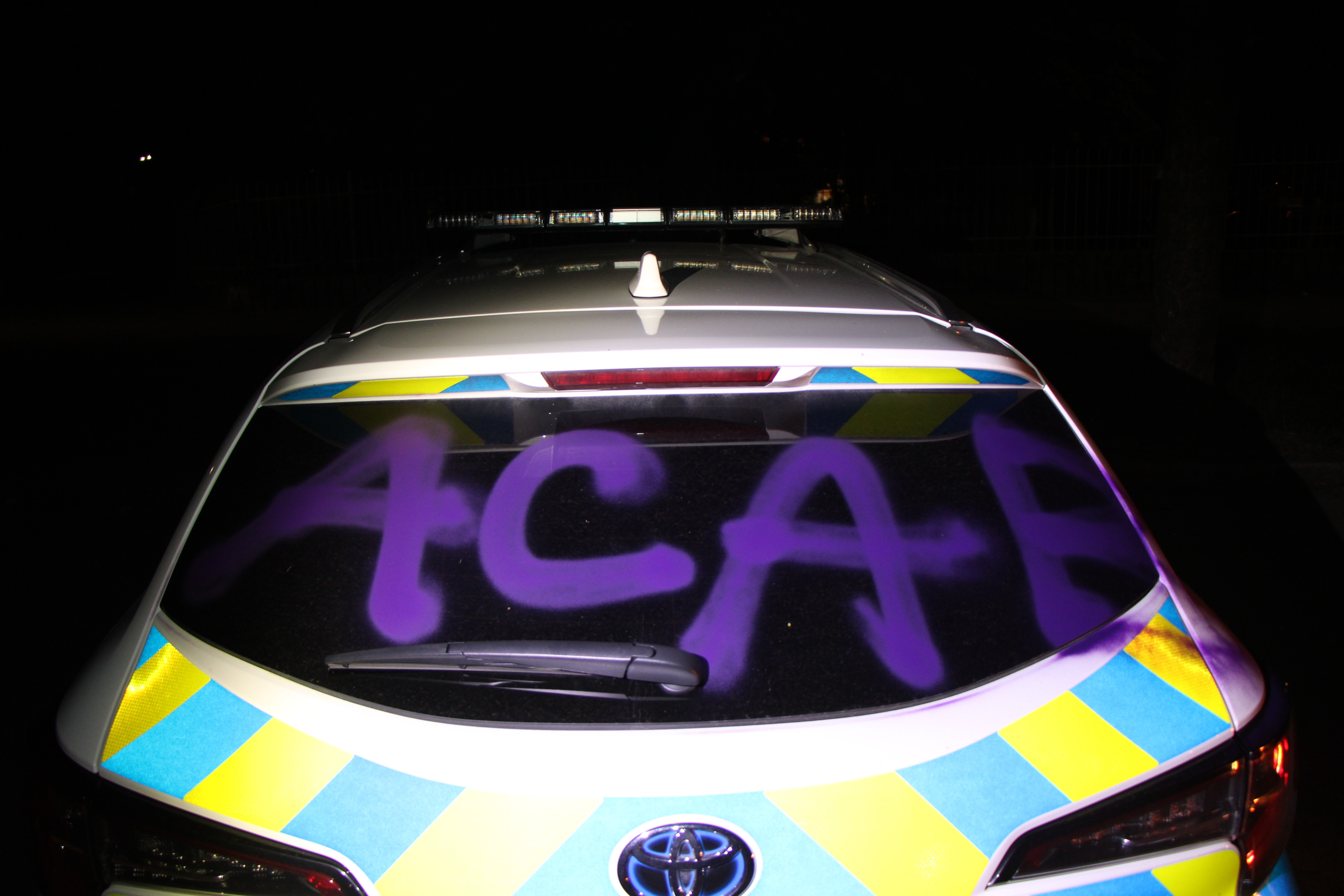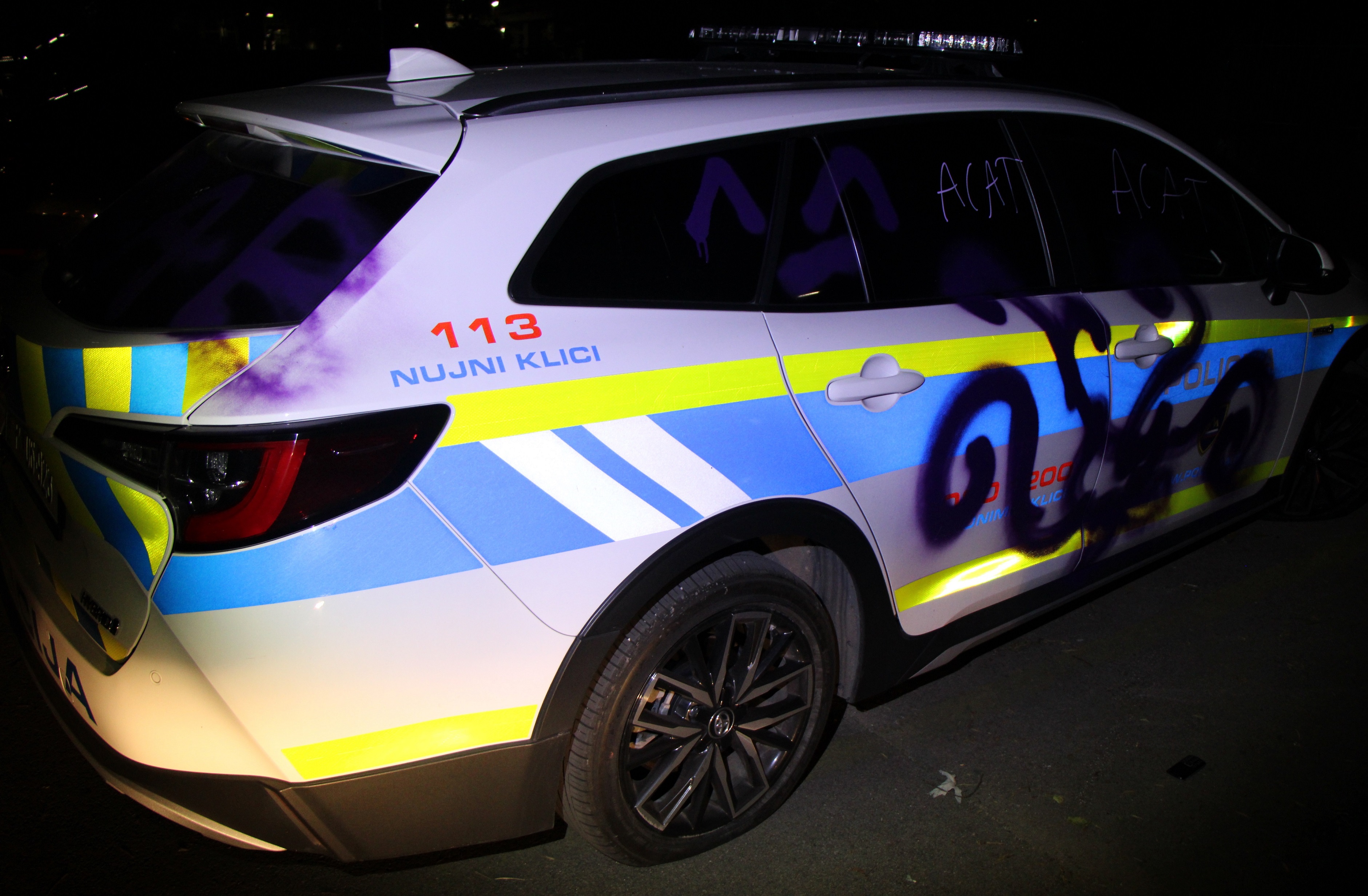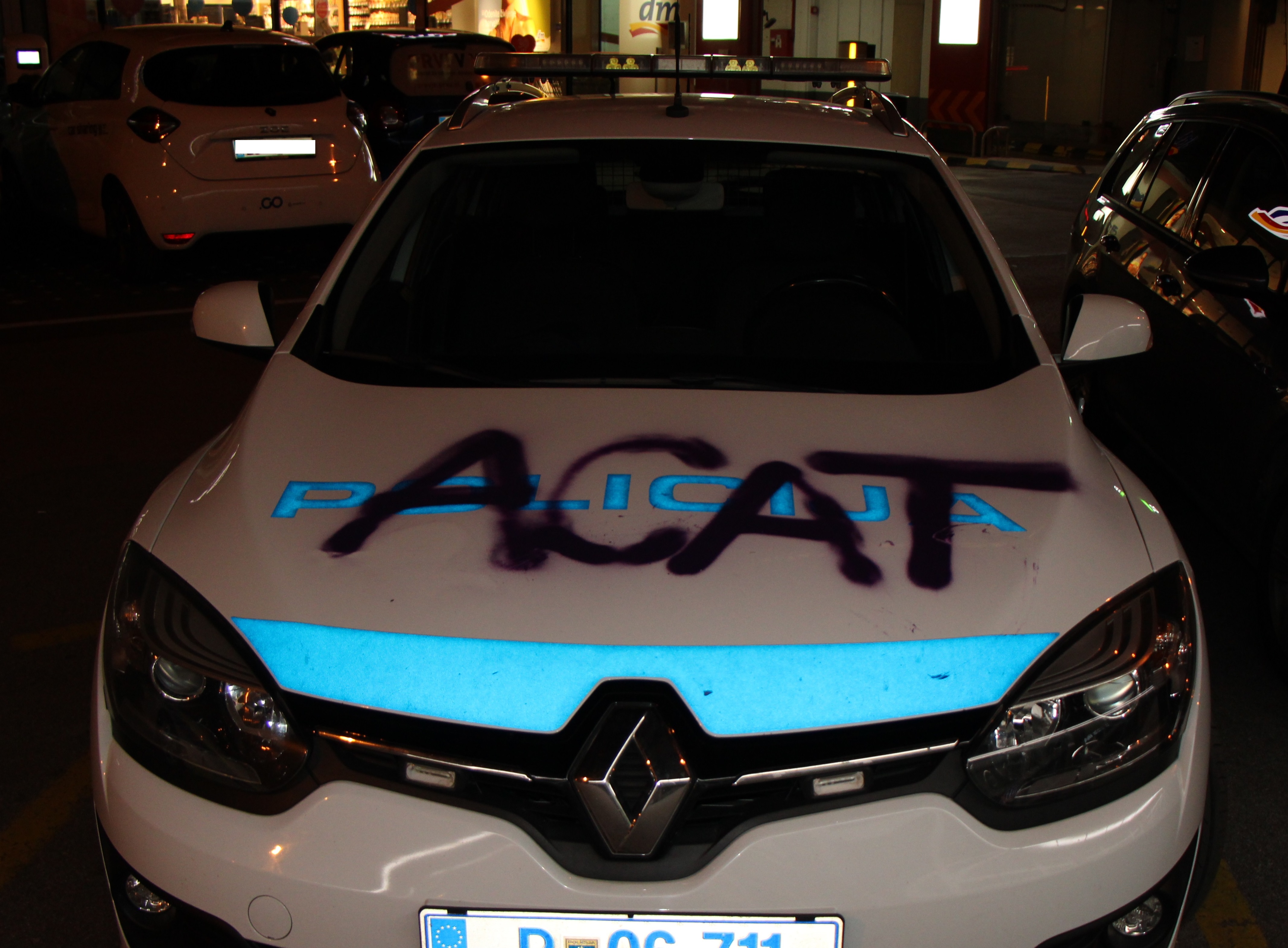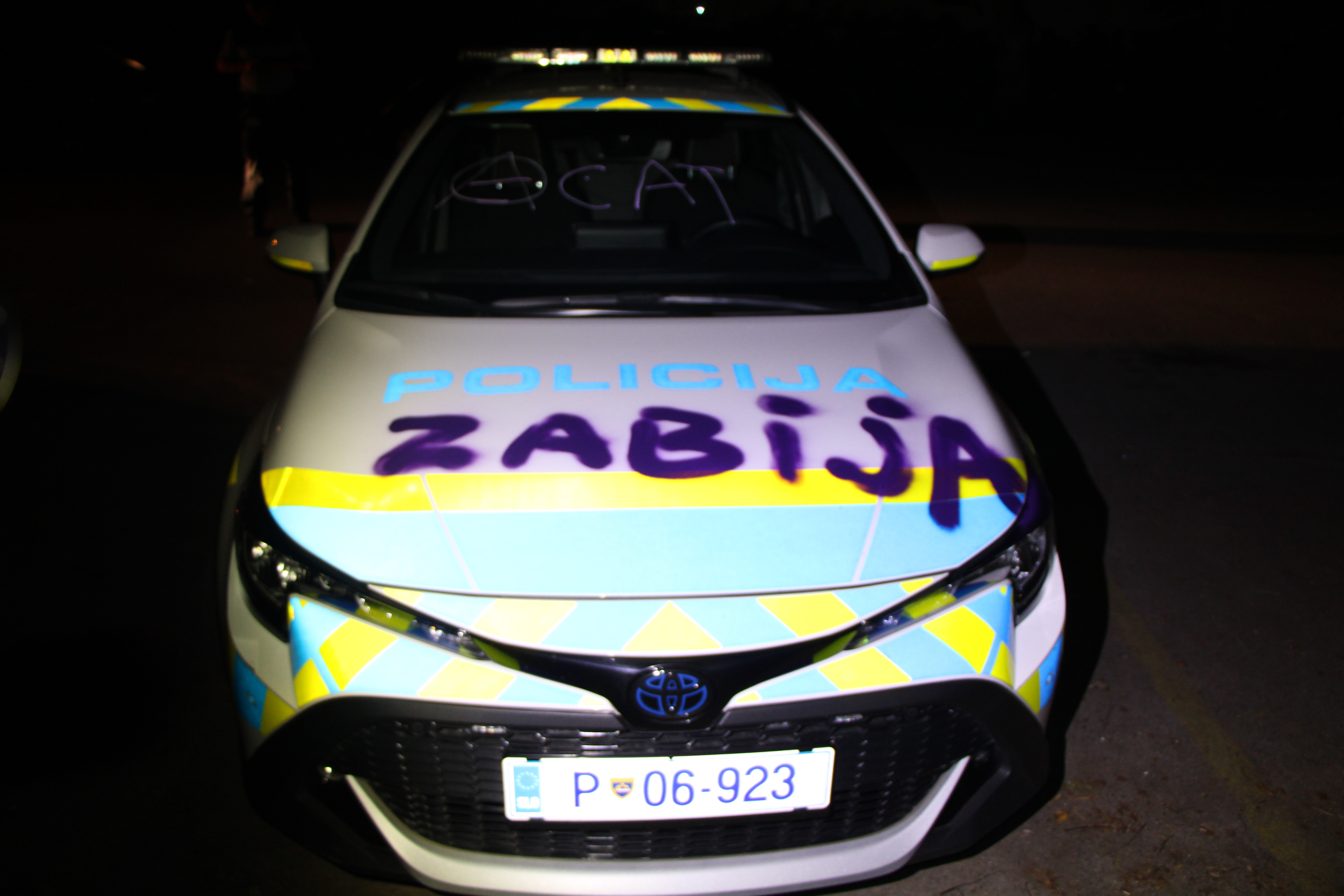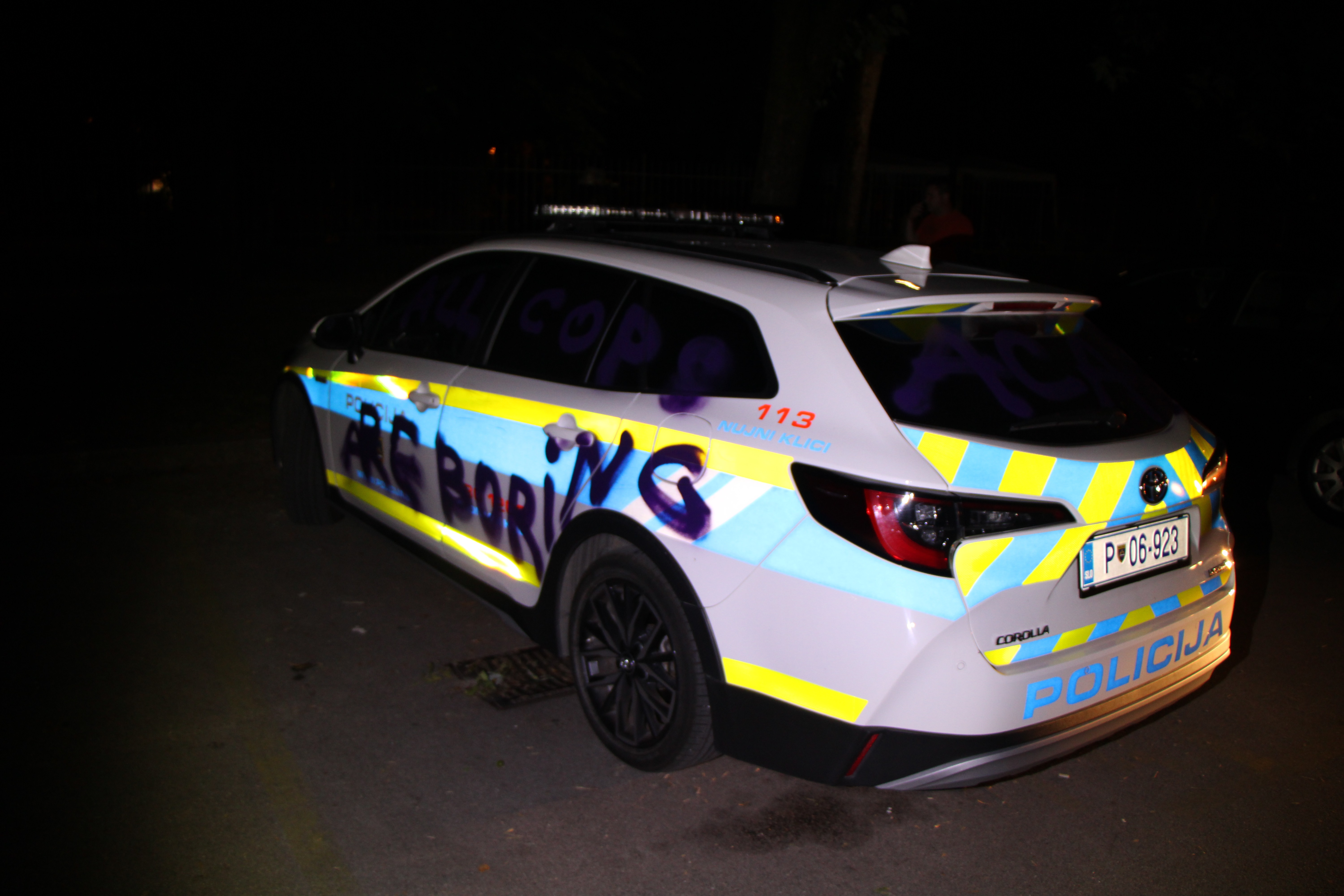 Med pohodom po ljubljanskih ulicah so neznanci s spreji prebarvali tudi dva parkirana policijska avtomobila in s tem povzročili okoli 6.000 evrov materialne škode.