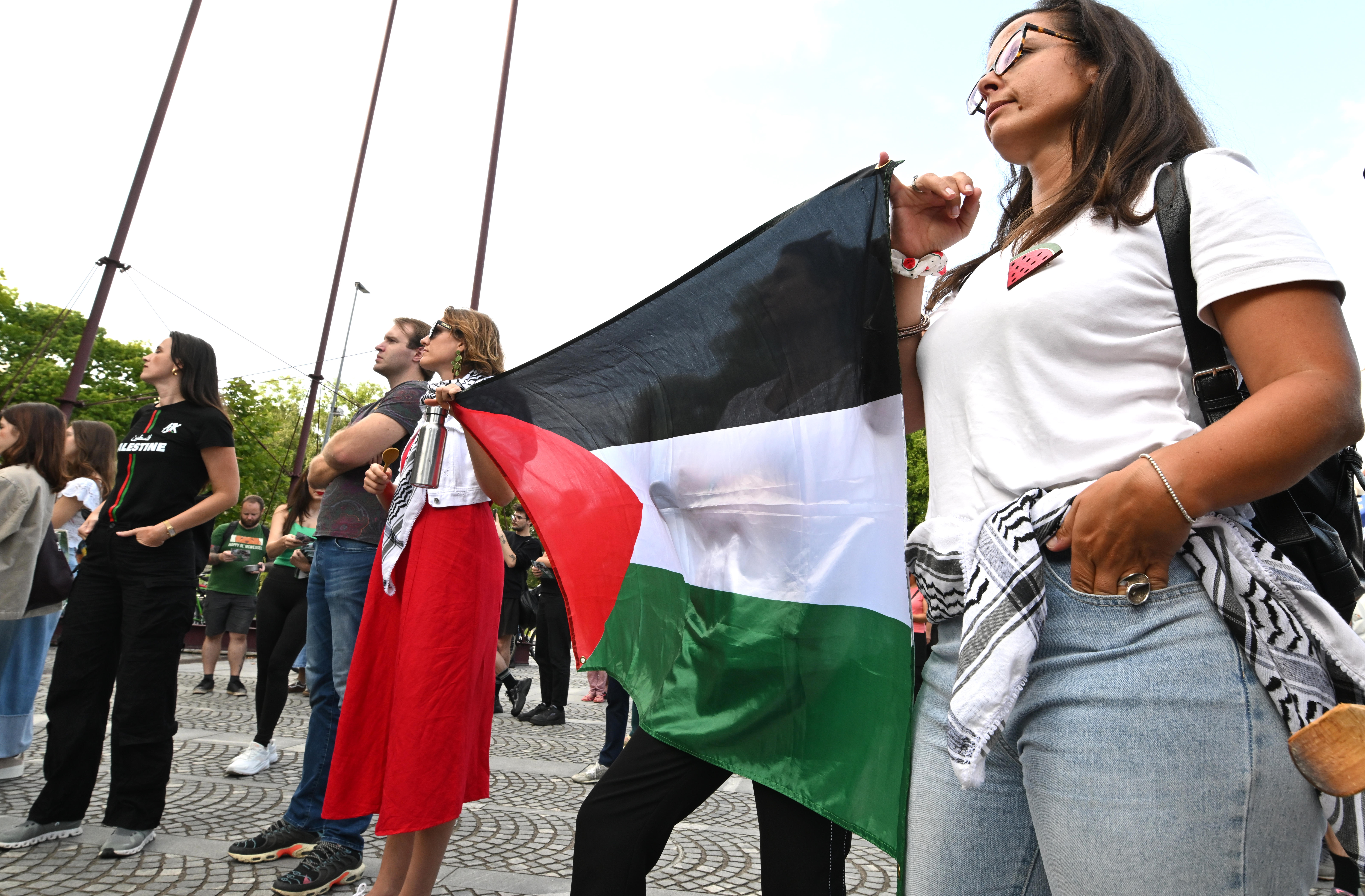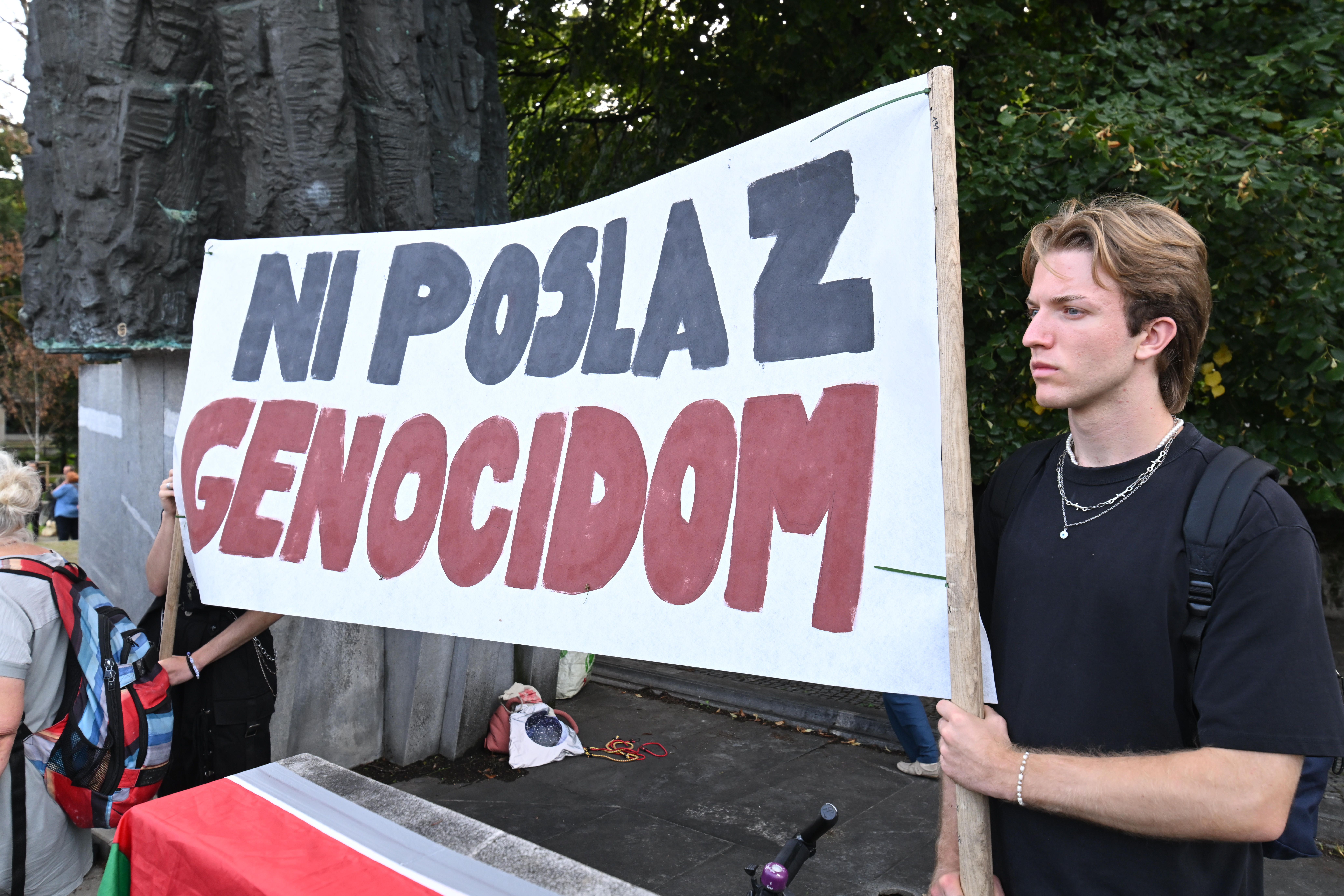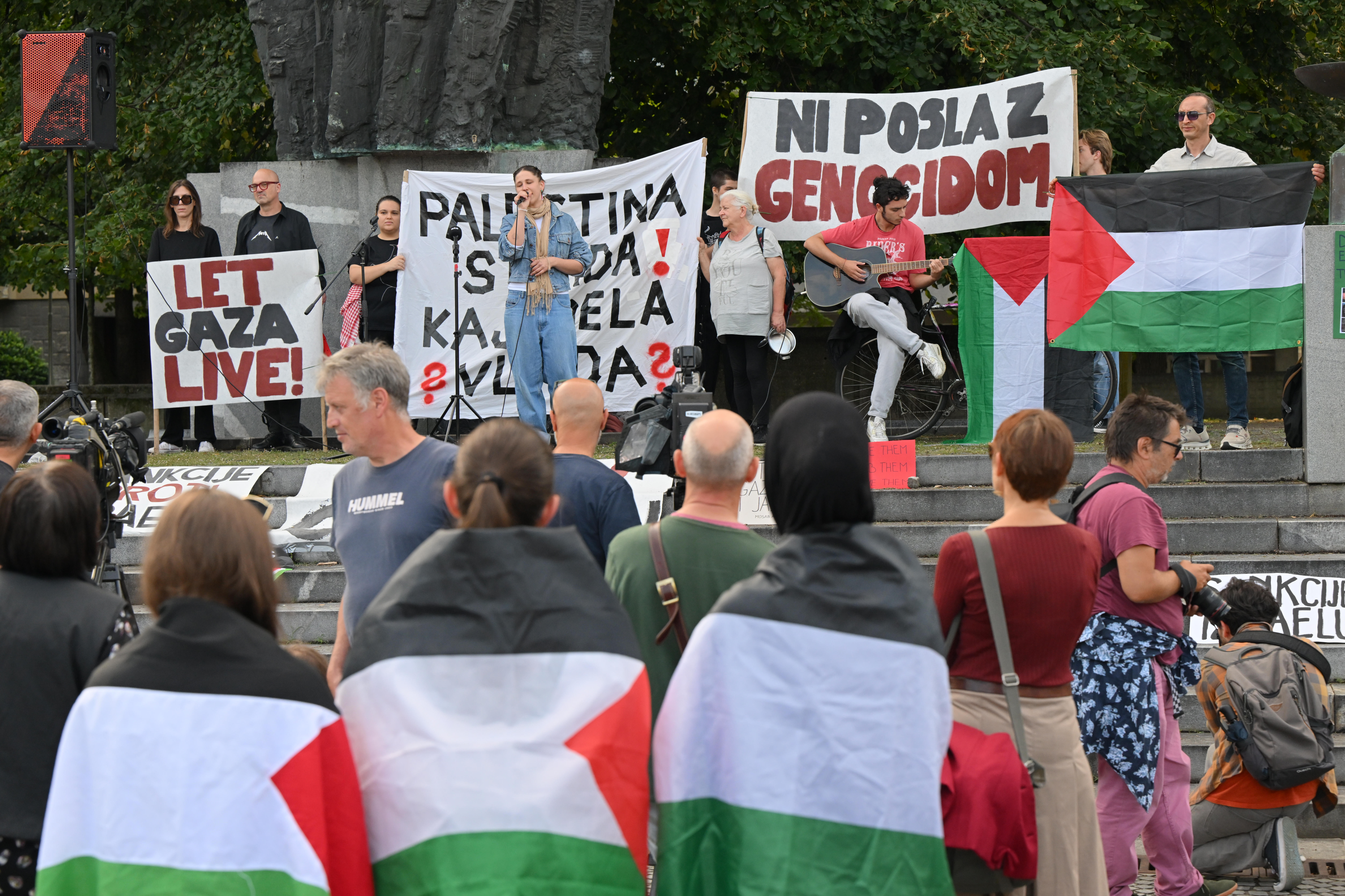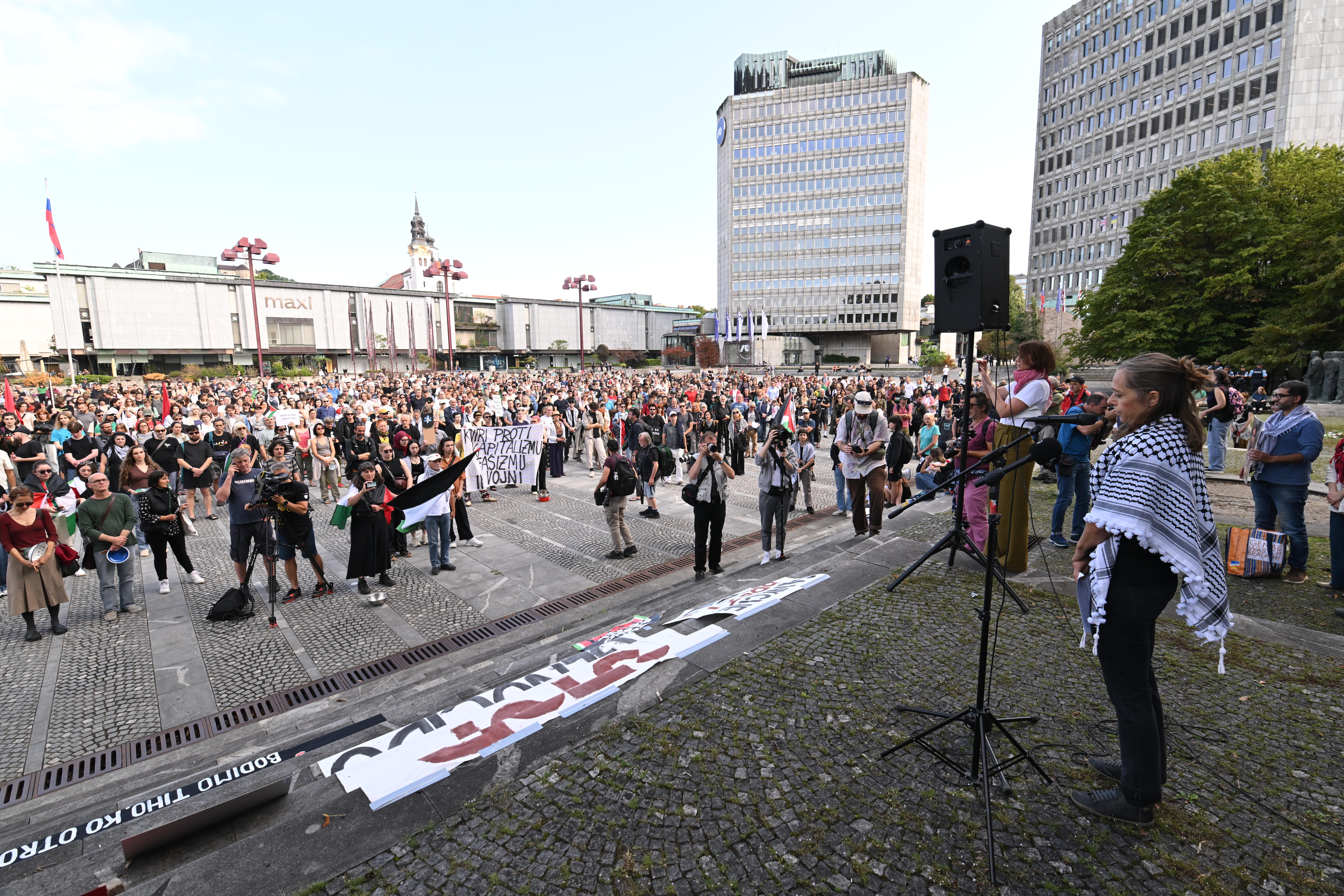 VečNa odru sta zbrane pred shodom, med katerim so protestirali tudi pred sedežem vlade, nagovorila sirski založnik, pesnik in pisatelj palestinskega rodu Mohamad Abdul Monae, ter nekdanja socialna delavka na srednji šoli v Gazi Etaf Abdelrahman, ki je zatočišče našla v Sloveniji.
