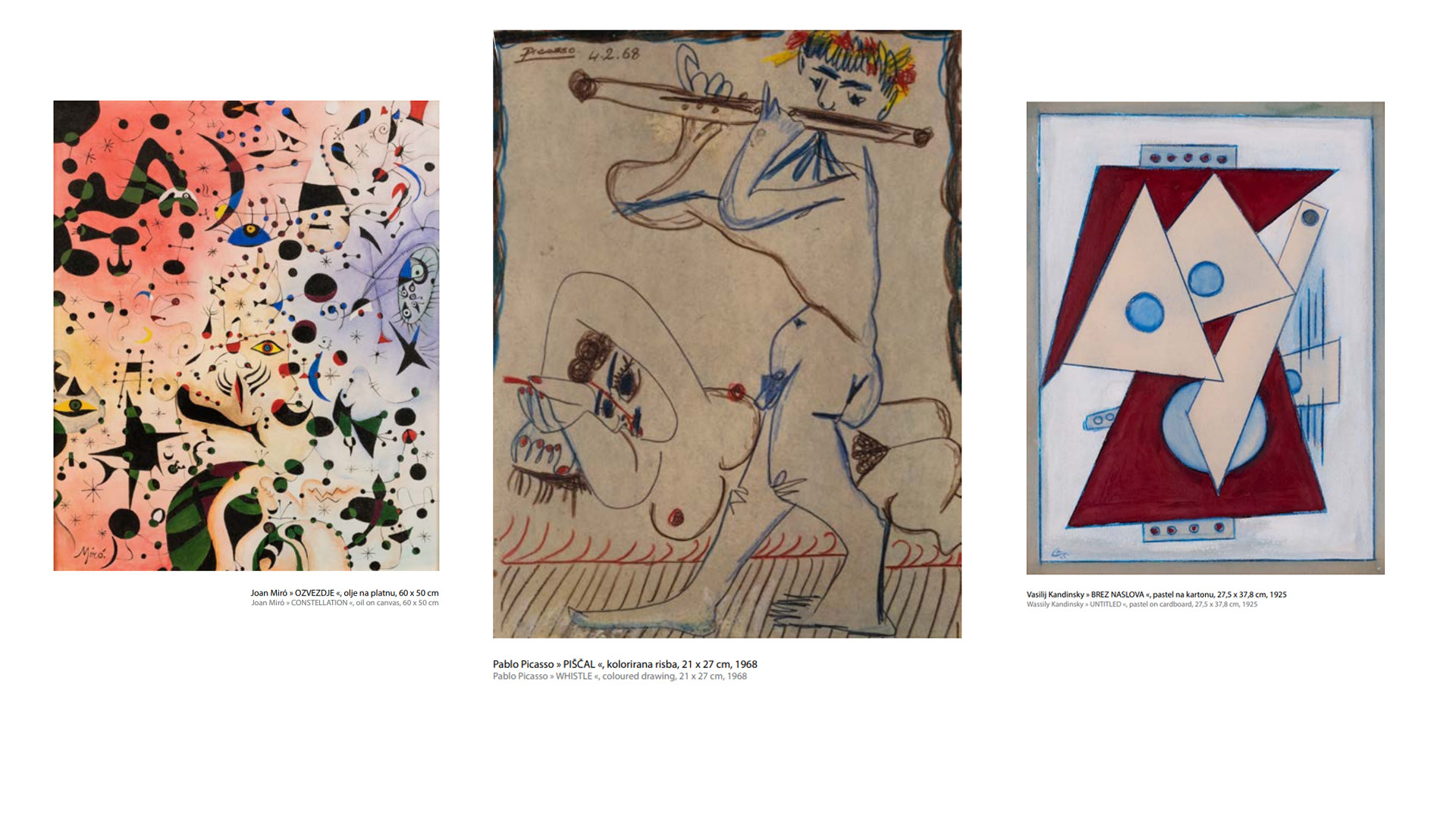 Ekskluzivno objavljamo 172-stranski katalog razstave Popotovanja, v katerem so popisana dela, ki naj bi jih naslikala največja svetovna imena slikarstva. Med njimi je devet slik in en kip, ki naj bi jih ustvaril sloviti španski umetnik Pablo Picasso, pa tudi slike izjemnih avtorjev, kot so Vincent van Gogh, Amadeo Modigliani, Paul Klee, Oskar Kokoschka, Piet Mondrian, Alfred Sisley, Camille Pissarro, Claude Monet, Edgar Degas, Georges Braque, Henri Matisse, Pierre-Auguste Renoir, Paul Cézanne, Henri de Toulouse-Lautrec, Joan Miró, Joseph William Turner, Edvard Munch, Kazimir Malevič, Marc Chagall, Vasilij Kandinsky in drugi.