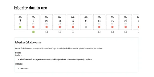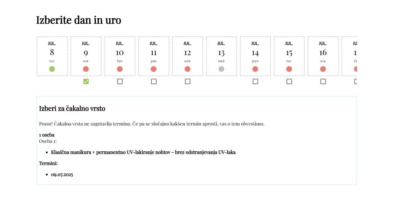 Tudi pri iskanju termina za pedikuro je bilo podobno. Izbrali smo klasično pedikuro s permanentnim UV-lakiranjem, saj je zaradi zgoraj omenjenega razloga ta med bolj priljubljenimi. Tudi v tem primeru prost termin v desetih dneh, ki jih sistem prikaže, ni bil na voljo. Možnost, ki jo ima stranka, je, da izbere termin, za katerega se želi postaviti v čakalno vrsto. A ob tem se izpiše opozorilo: "Čakalna vrsta ne zagotavlja termina, če pa se slučajno kakšen sprosti, vas o tem obvestimo."