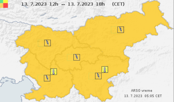 Tudi danes bodo možna krajevna neurja po celotni državi. Čez dan se bodo plohe in nevihte postopno razširile nad vso Slovenijo, Agencija RS za okolje (Arso) pa je izdala oranžno opozorilo. Za južni del države pa je oranžno opozorilo razglašeno tudi zaradi toplotne obremenitve.