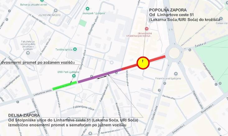 Na Linhartovi cesti v Ljubljani se nadaljujejo dela. Cesto so zato danes na odseku od URI Soča do krožišča Štajerske in Savske ceste ter Flajšmanove in Žalske ulice znova popolnoma zaprli v obe smeri.