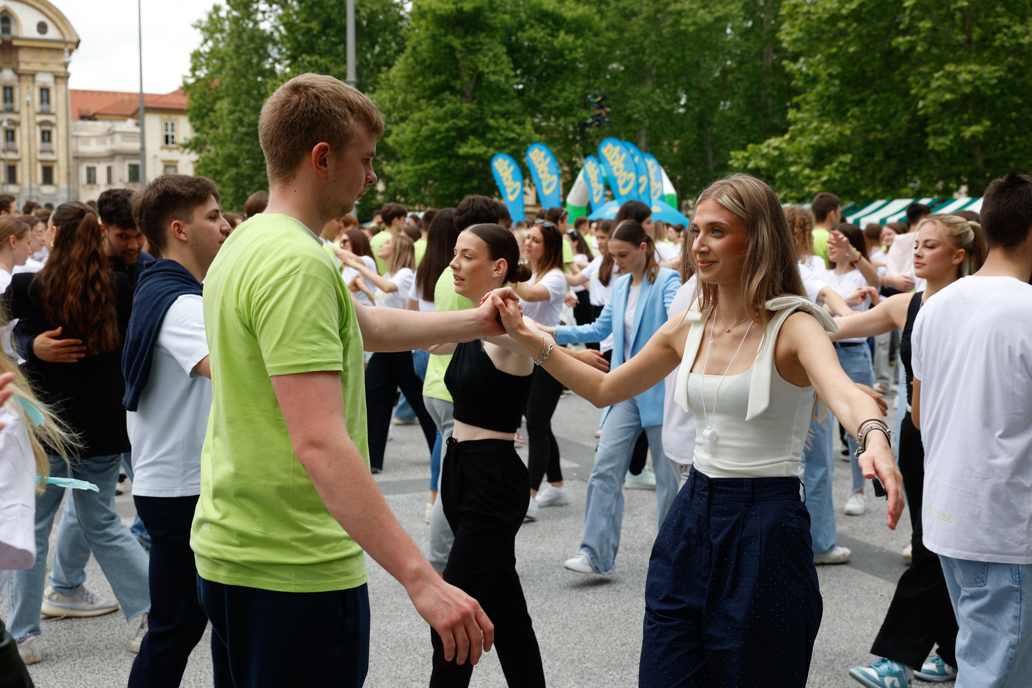 VečTočno opoldne je iz zvočnikov zadonela opereta Netopir Johanna Straussa. Energija je bila nalezljiva, tudi tisti, ki smo samo stali ob strani in jih opazovali, smo tiho in neopazno brundali in topotali z nogami. Po četvorki so sledili še drugi plesi, ki so del maturantskega repertoarja, od angleškega valčka do tanga.