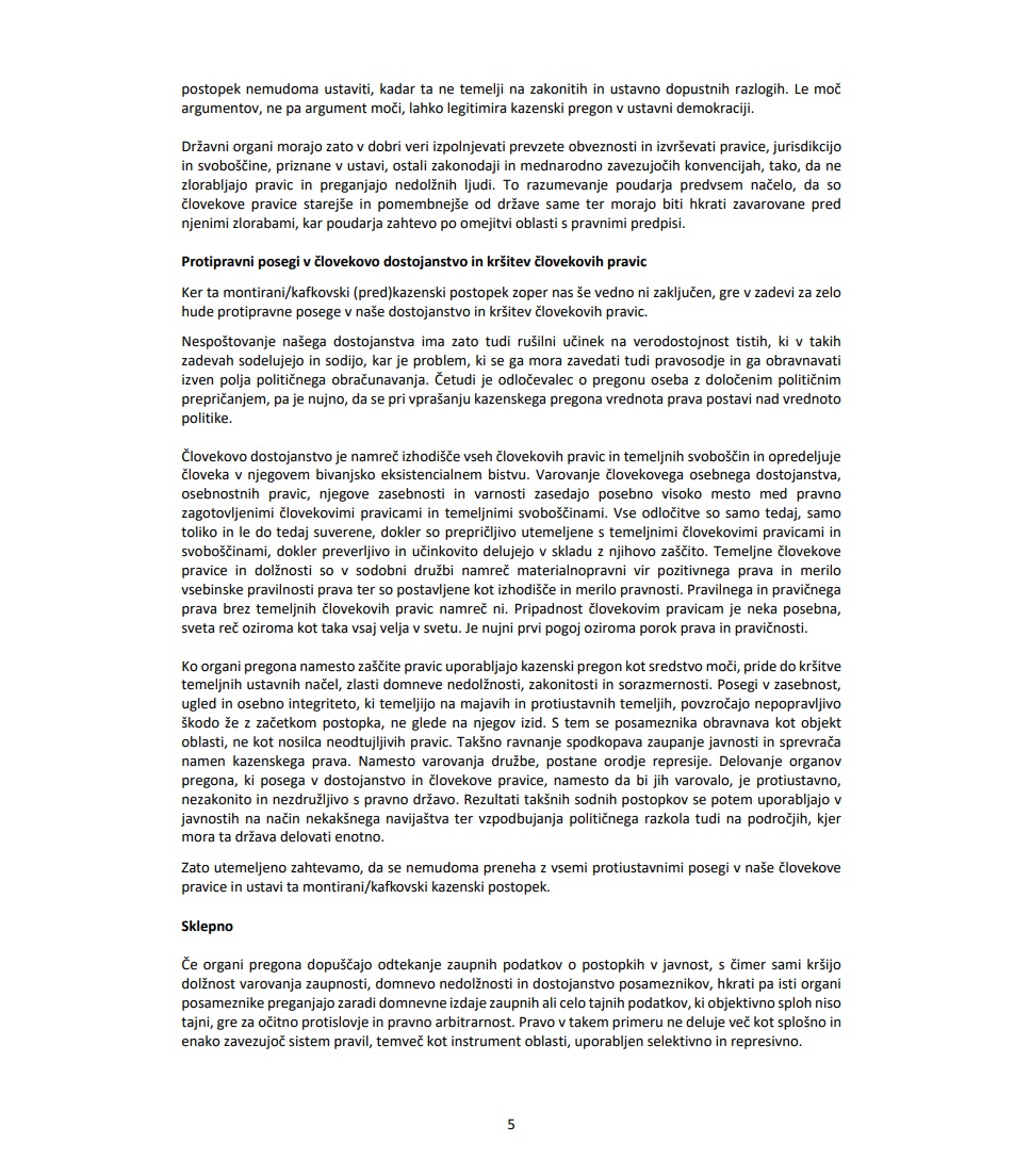 "Menimo, da ta proces meče izjemno slabo luč na status večstrankarskega sistema in ogroža temelje demokratičnih procesov v Republiki Sloveniji. Uporaba tega procesa za namen političnega obračunavanja tik pred ali kar med volitvami v letu 2026 bo lahko drastično negativno vplivala na položaj pravosodja, saj bodo institucije pravosodja razumljene v javnosti zgolj še kot orodje v rokah politično-kapitalskih elit," so v dopisu ocenili Jernej Vrtovec, Jožef Horvat, Matej Tonin in Janez Žakelj.