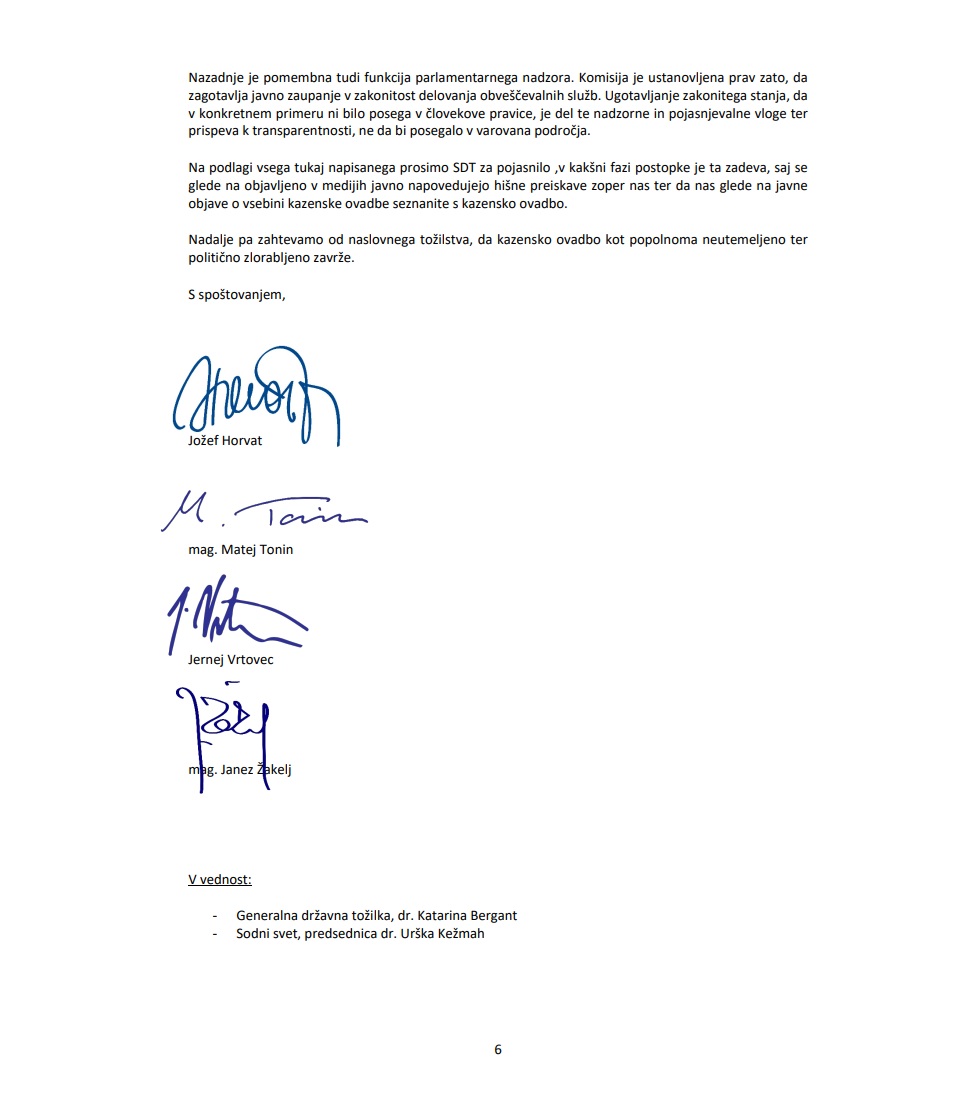 Dopis so naslovili na Specializirano državno tožilstvo, ki zadevo obravnava, v vednost je bil posredovan tudi generalni državni tožilki Katarini Bergant in predsednici Sodnega sveta Urški Kežmah.