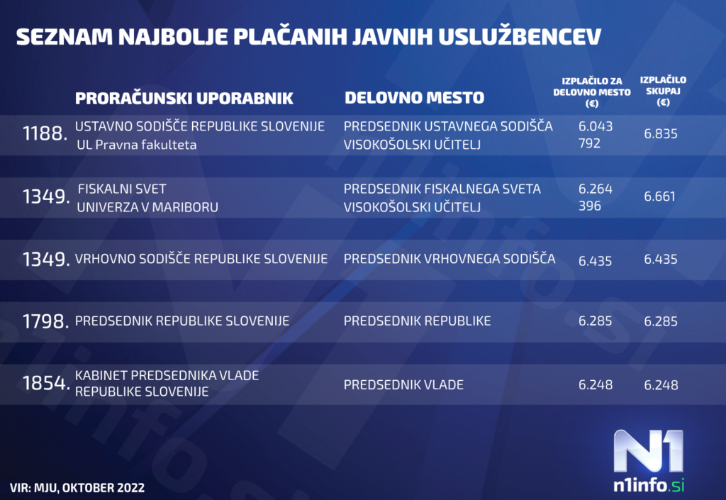 Med tisoč najbolje plačanimi javnimi uslužbenci je daleč največ zdravnikov. Najvišje izplačilo za mesec oktober, 15.156 evrov bruto, je prejel zdravnik ljubljanskega kliničnega centra. Na seznamu je tudi nekaj pilotov Slovenske vojske. Predsednik vlade Robert Golob je oktobra prejel 6.249 evrov bruto in se s tem uvrstil na 1.854. mesto lestvice. Višje izplačilo kot premier sta med drugim prejela njegova varnostnika.