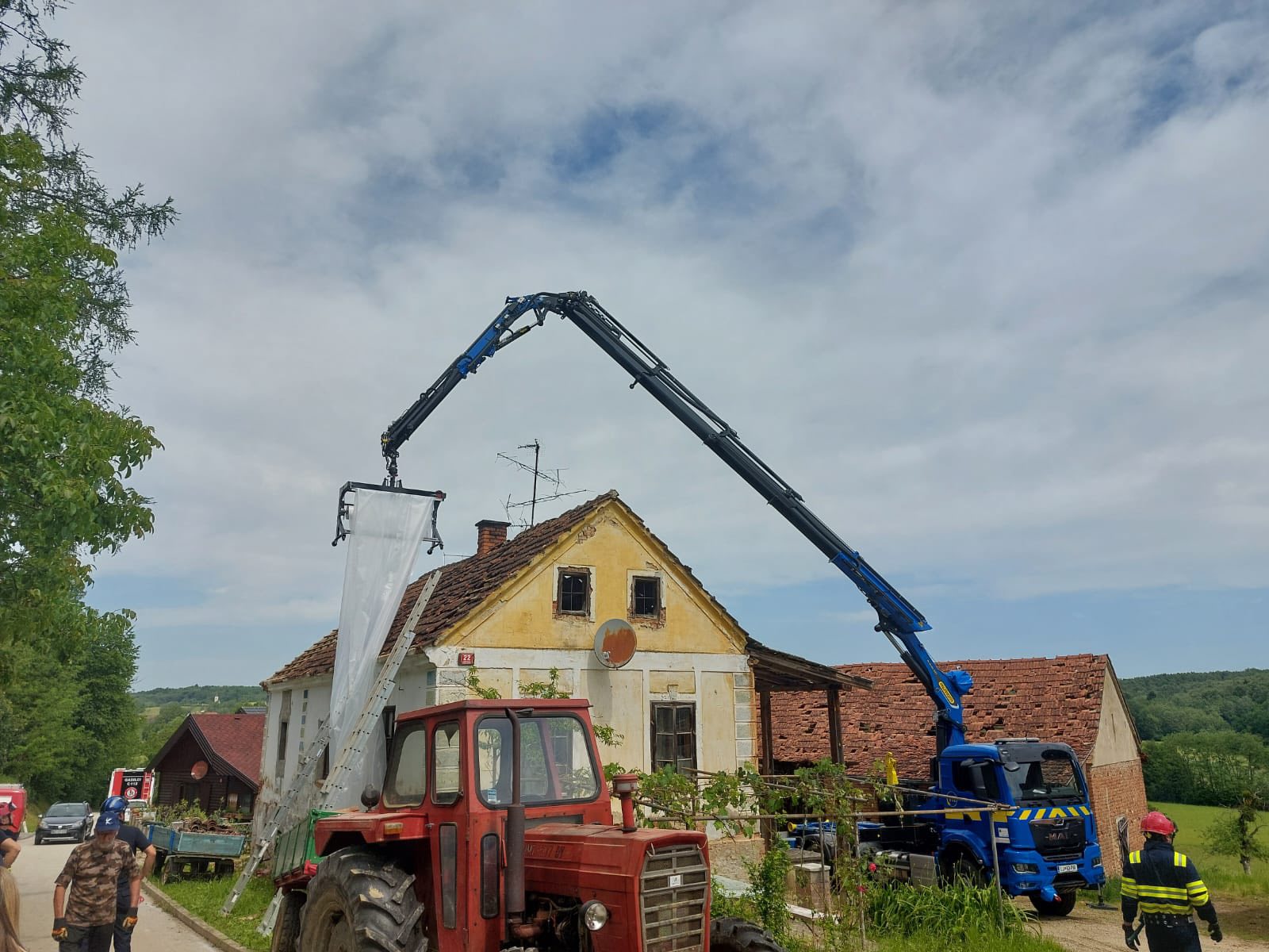 Po torkovi katastrofalni nevihti na Goričkem ekipe civilne zaščite in gasilcev s folijami prekrivajo poškodovane stanovanjske hiše. Skrbi jih, da bi hiše namočilo, saj je za nedeljo napovedan dež. Številni sami posledic ne bodo zmogli odpraviti, država pa bo lahko ukrepala šele, ko bo ocenjena vsa škoda. Prizadeti sicer lahko zaprosijo tudi za izredno denarno socialno pomoč.