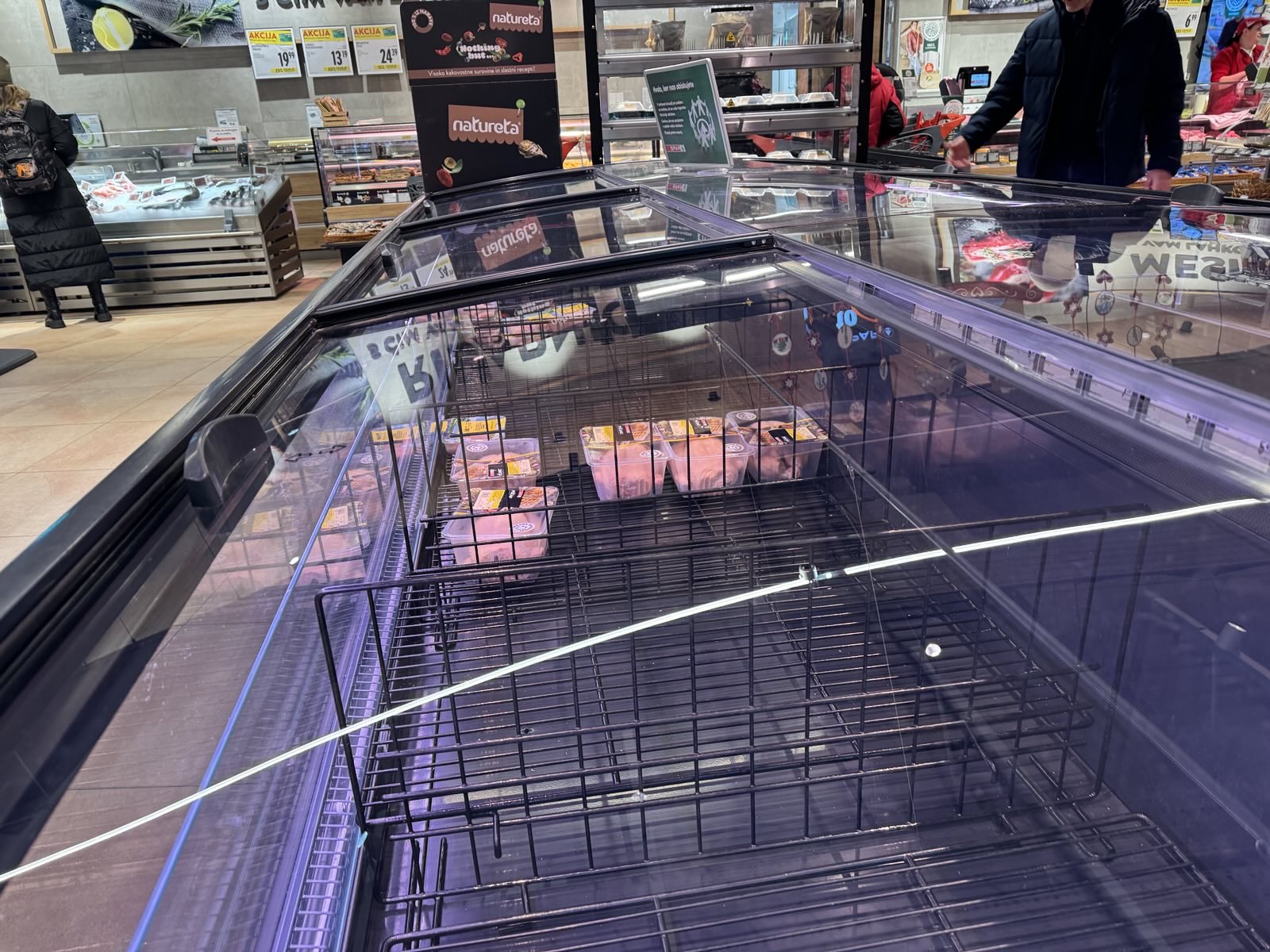 A kot so za N1 sporočili bralci, so trgovske police v nekaterih Sparovih trgovinah danes pošteno prazne, manjka predvsem mesa, pa tudi drugih izdelkov. To so prizori danes dopoldan iz Interspara v nakupovalnem središču Europark v Mariboru.